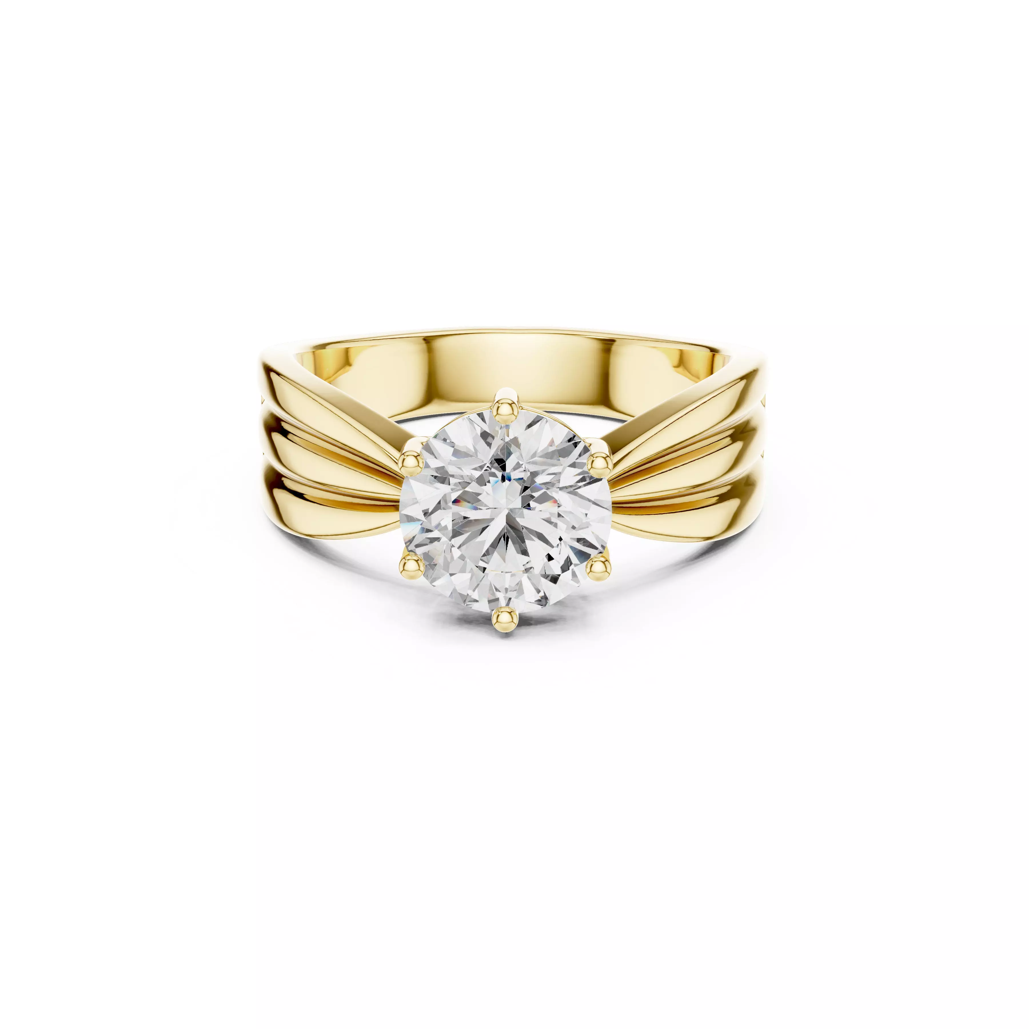 round solitaire ring, fluted band engagement ring, multi shank diamond ring, six prong solitaire, bold bridal ring 3d model, jewelry 3dm file, stl ring model, 3d print engagement ring, gold diamond ring cad, rhino jewelry model, architectural engagement ring, designer solitaire ring, luxury bridal ring