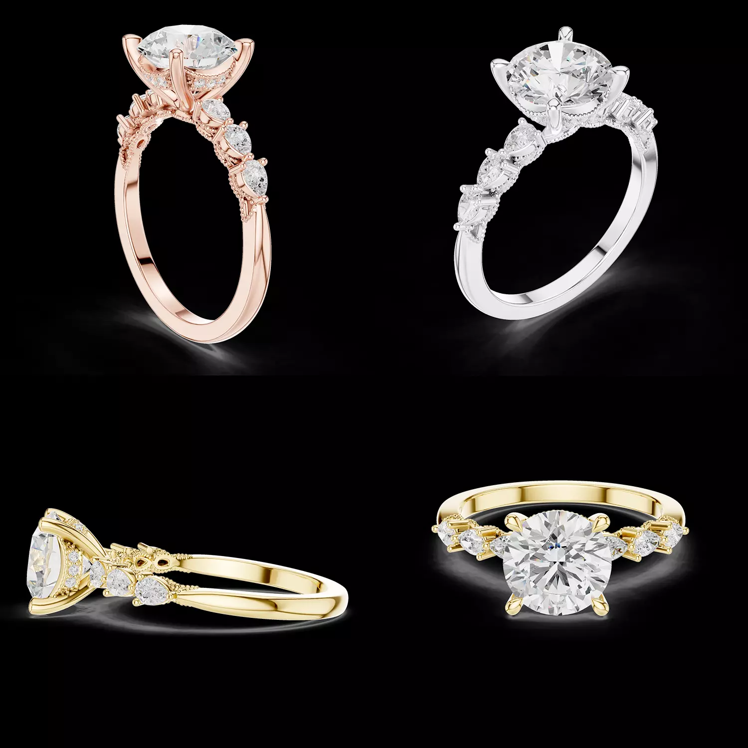Presenting a luxurious Round Diamond Engagement Ring featuring a hidden halo, marquise side stones, and refined vintage-inspired detailing. This elegant design combines timeless brilliance with intricate craftsmanship, making it perfect for premium bridal and fine jewellery collections.