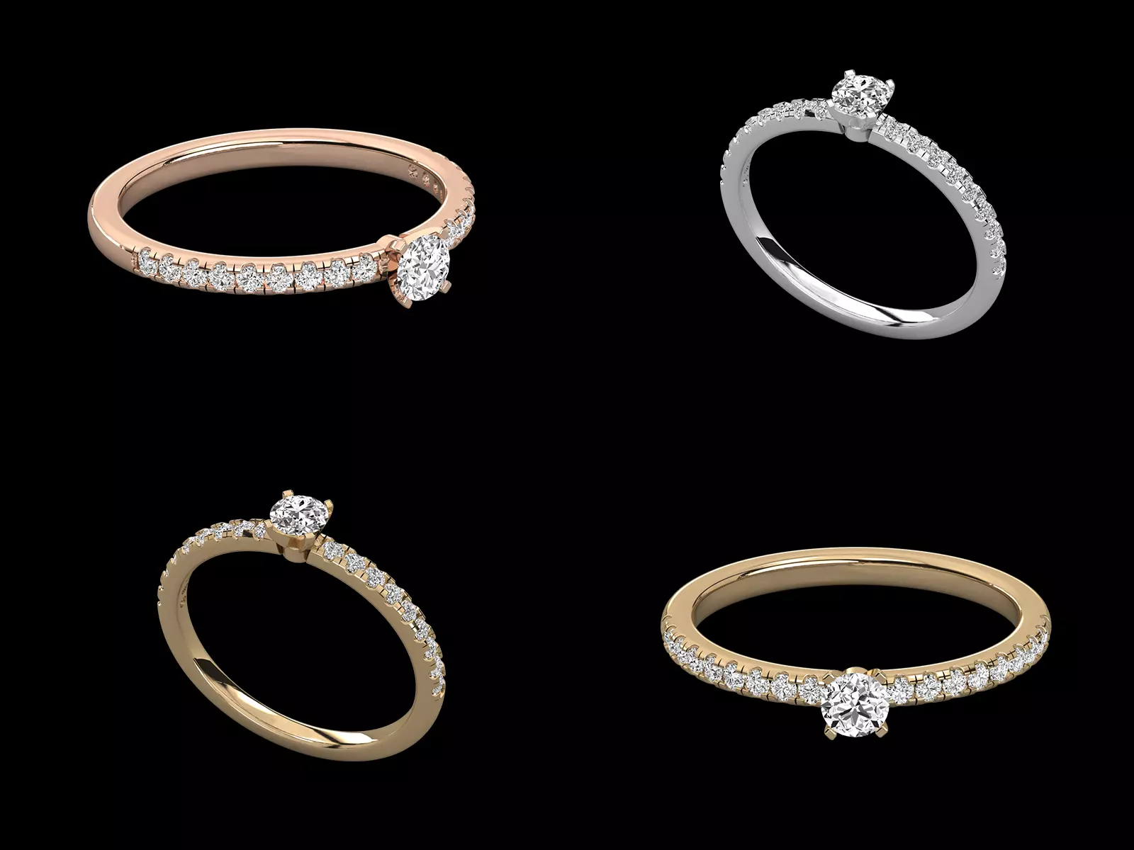 This jewellery CAD ring design includes a round solitaire center diamond with pavé-set diamonds on a thin and elegant shank. The ring is lightweight, comfortable, and optimized for professional jewellery production.