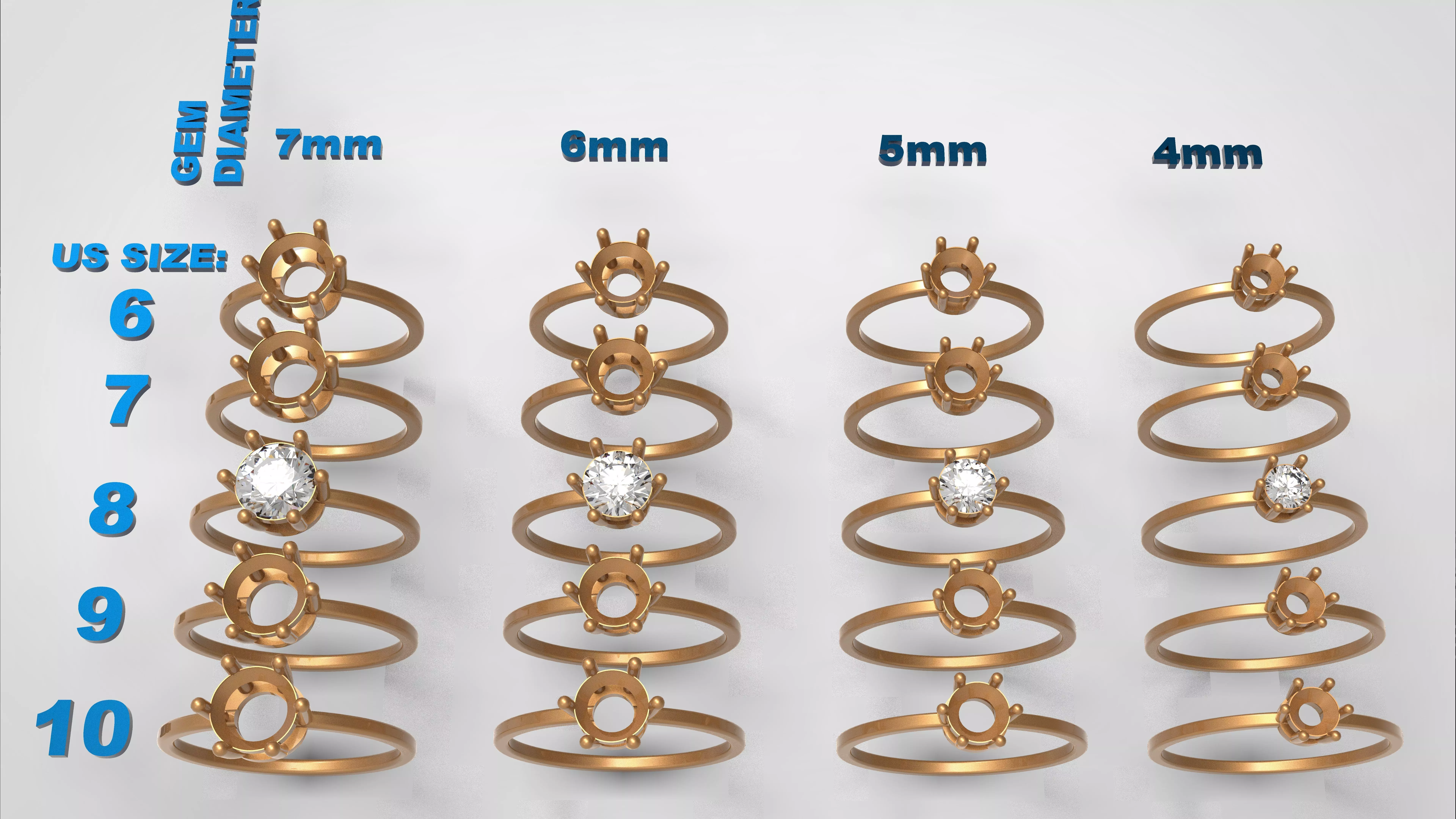 This package includes a complete set of round solitaire engagement ring models designed for proffessional jewelry production. The Solitaire settings are designed with six-prong bases, with the prongs notched by the stone cutter to properly seat the gemstone.