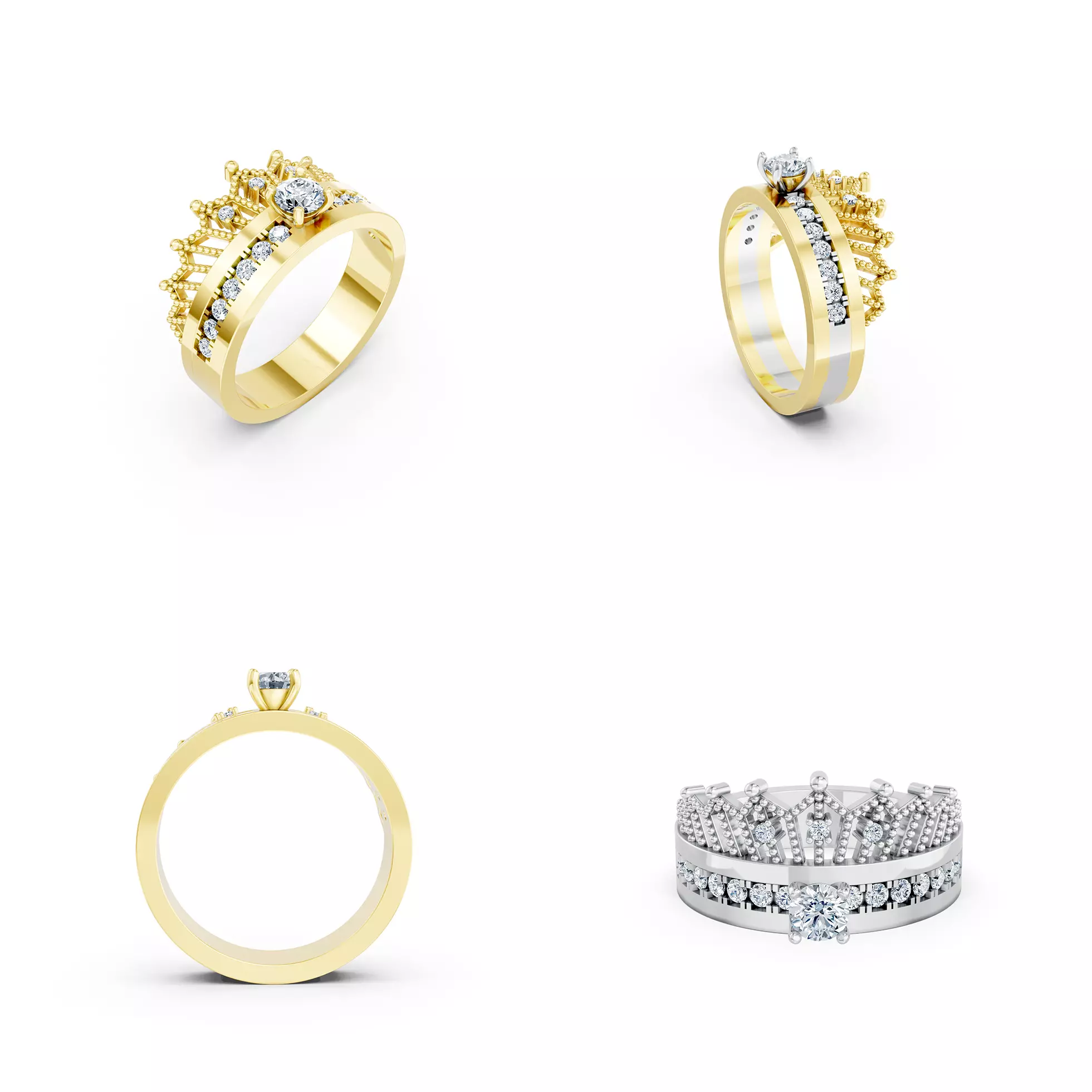 This royal crown-inspired diamond ring CAD model showcases a bold and luxurious structure with a raised crown-style top. The center solitaire diamond is highlighted by detailed vertical crown elements and a diamond-studded band, creating a statement look suitable for premium bridal and luxury jewellery collections.