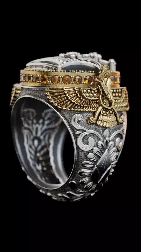 Royal Crown Ring – Persian Heritage DesignA highly detailed ring design featuring a royal crown centerpiece, symbolizing power and nobility.On both sides of the ring, two finely crafted Faravahar symbols are integrated with exceptional precision, representing Persian identity, wisdom, and eternity.The shank is inspired by traditional Iranian engraving, with intricate hand-carved patterns that enhance the depth and authenticity of the design.This ring is a combination of gold and silver, carefully balanced to create a luxurious yet timeless piece of jewelry.High-detail modelingSuitable for production (casting-ready)Ideal for luxury, heritage, and symbolic jewelry collections