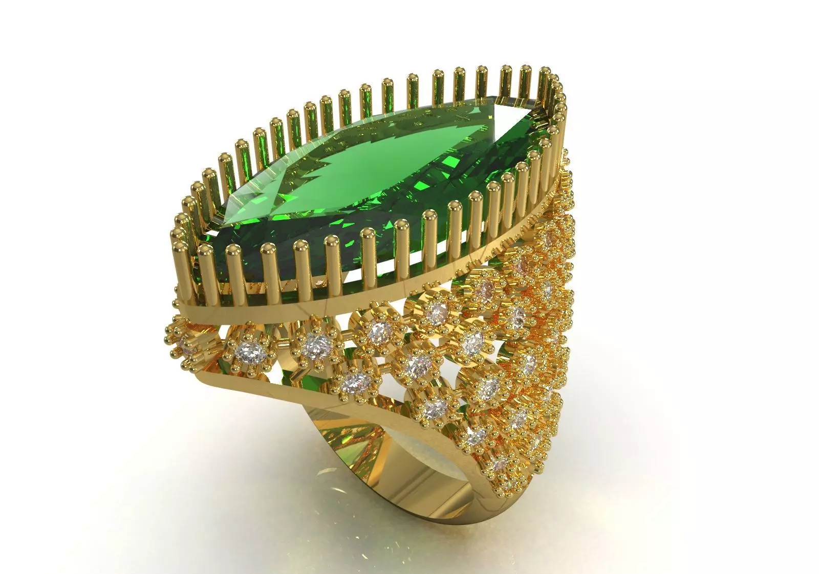 Ring JR00278: Royal Emerald/Peridot Cocktail Ring, a symbol of splendor, textured luxury and classic grandeurThe JR00278 ring is an Extremely Large, Royal Statement Ring featuring a large marquise-cut emerald green center stone surrounded by a Coronet/Crown Setting and diamond side clusters. The piece focuses on three-dimensional volume, green and yellow gold contrast, and textured floral details, creating an extremely luxurious and grand look.