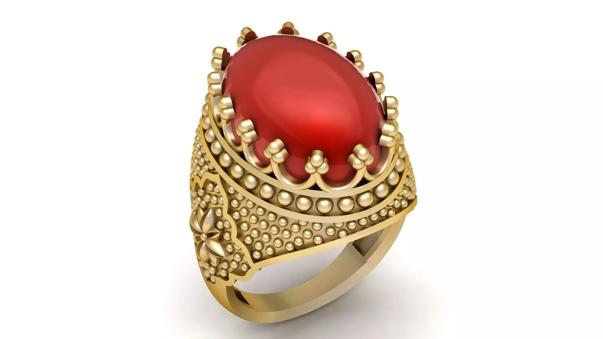 The band is richly detailed with beadwork textures and ornamental motifs, giving the ring a regal, antique-inspired character. Every curve and detail is carefully modeled to ensure balance, durability, and casting readiness, making this piece ideal for high-end jewelry production and bespoke collections.