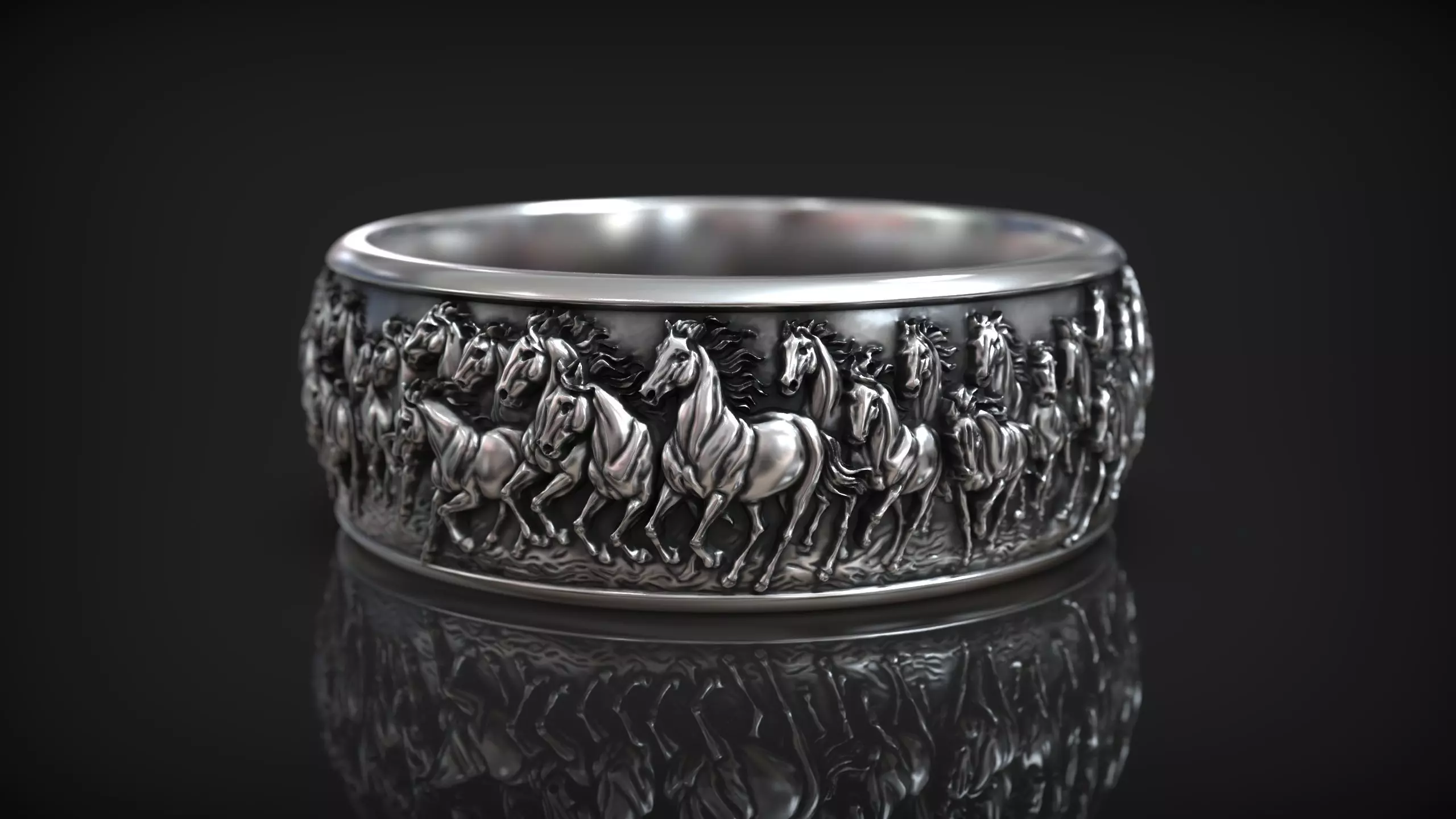 This expertly sculpted 3D band ring features a continuous bas-relief of galloping horses, capturing motion, power, and natural beauty in a striking circular composition. Each horse is individually modeled with attention to anatomical realism - muscle definition, flowing manes, expressive heads, and energetic poses create the impression of a wild herd in full sprint.
