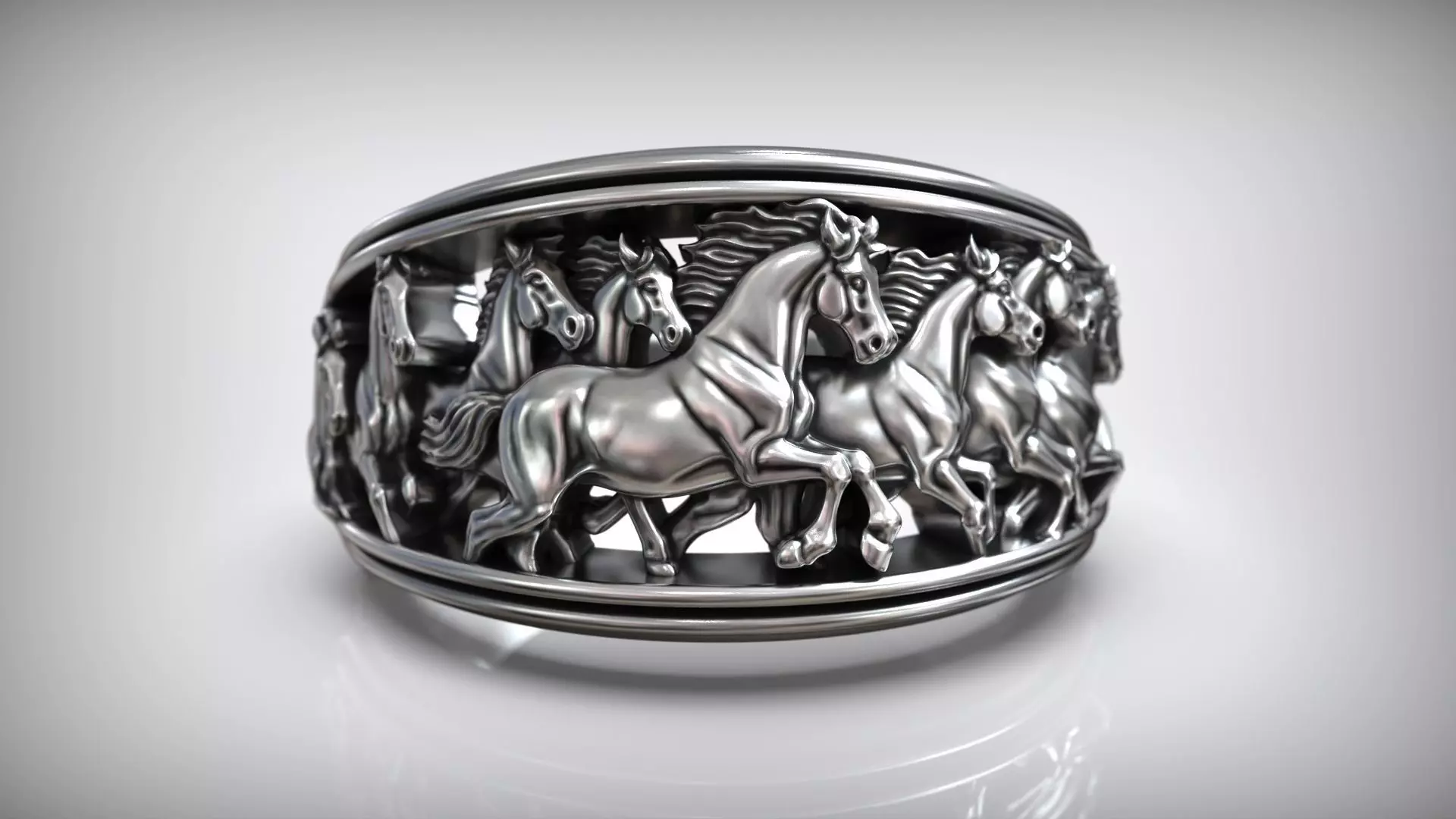This highly detailed ring features a continuous relief of running horses sculpted in a dynamic, flowing composition. Each horse is carefully modeled to capture motion, strength, and elegance, with emphasized musculature and expressive movement. The openwork design creates depth and visual lightness, while the smooth inner band ensures a comfortable fit.