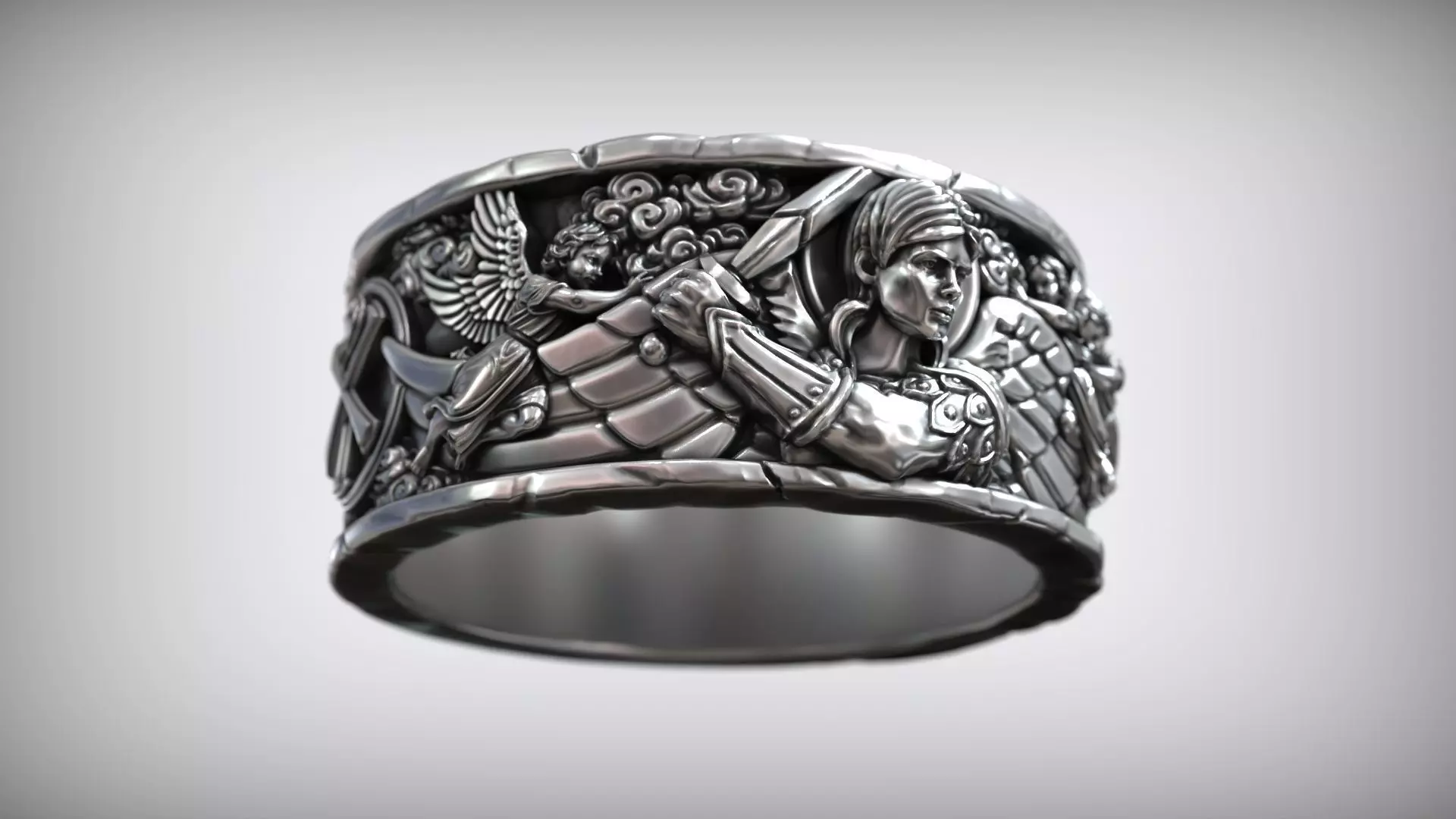 The sculpted relief wraps fully around the band, creating a continuous narrative of divine protection and spiritual strength. Each element - armor plates, feathers, clouds, and holy symbols - is modeled with precision to ensure excellent castability in silver, gold, or platinum.This model is ideal for artisans and jewelers seeking to create a statement ring with strong spiritual symbolism, Gothic energy, and museum-grade detailing.