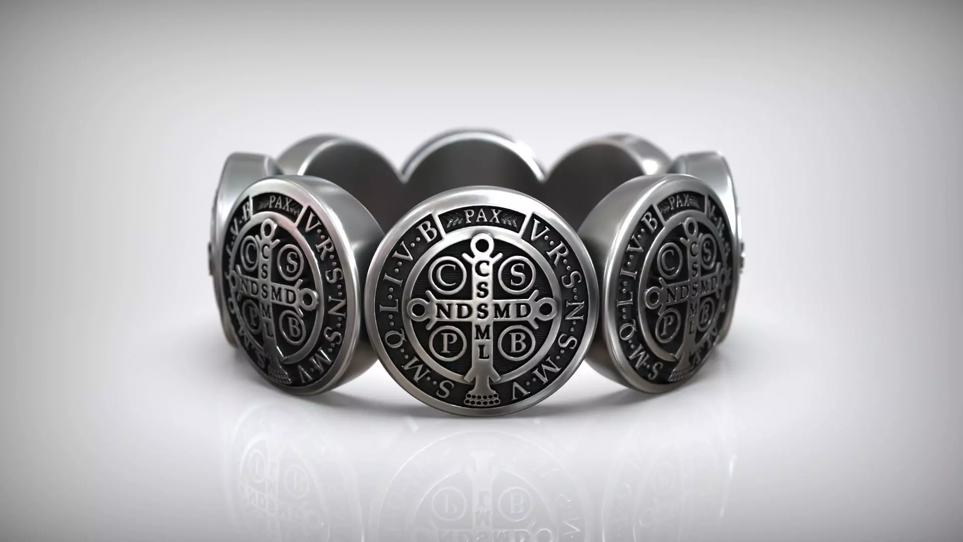 This 3D model presents a Saint Benedict ring featuring a detailed representation of the Medal of Saint Benedict, one of the most recognized symbols of protection in Christian tradition. The design showcases the front of the Benedictine Cross Medal, complete with precise Latin inscriptions and intricate relief engraving of the sacred monogram and exorcism initials.