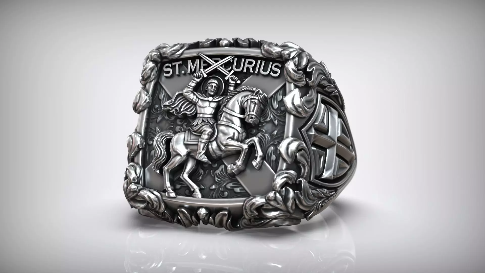 This 3D model presents a highly detailed signet ring featuring St. Mercurius, depicted as a mounted warrior-saint in full armor, raising two crossed swords in a dynamic battle pose. The central composition shows the saint on a rearing horse, surrounded by rich ornamental foliage that frames the scene like a sculpted relief. Deep carving, crisp contours, and multi-layered depth give the design a dramatic, museum-grade appearance suitable for premium jewelry production.