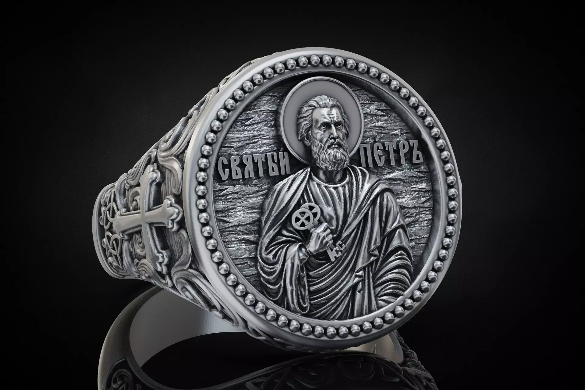 Description:Oval signet ring featuring high relief Saint Peter icon holding key, Cyrillic inscription, beaded frame border, stone texture background. Shank decorated with baroque scroll engraving, Celtic knot ornaments and large side cross.