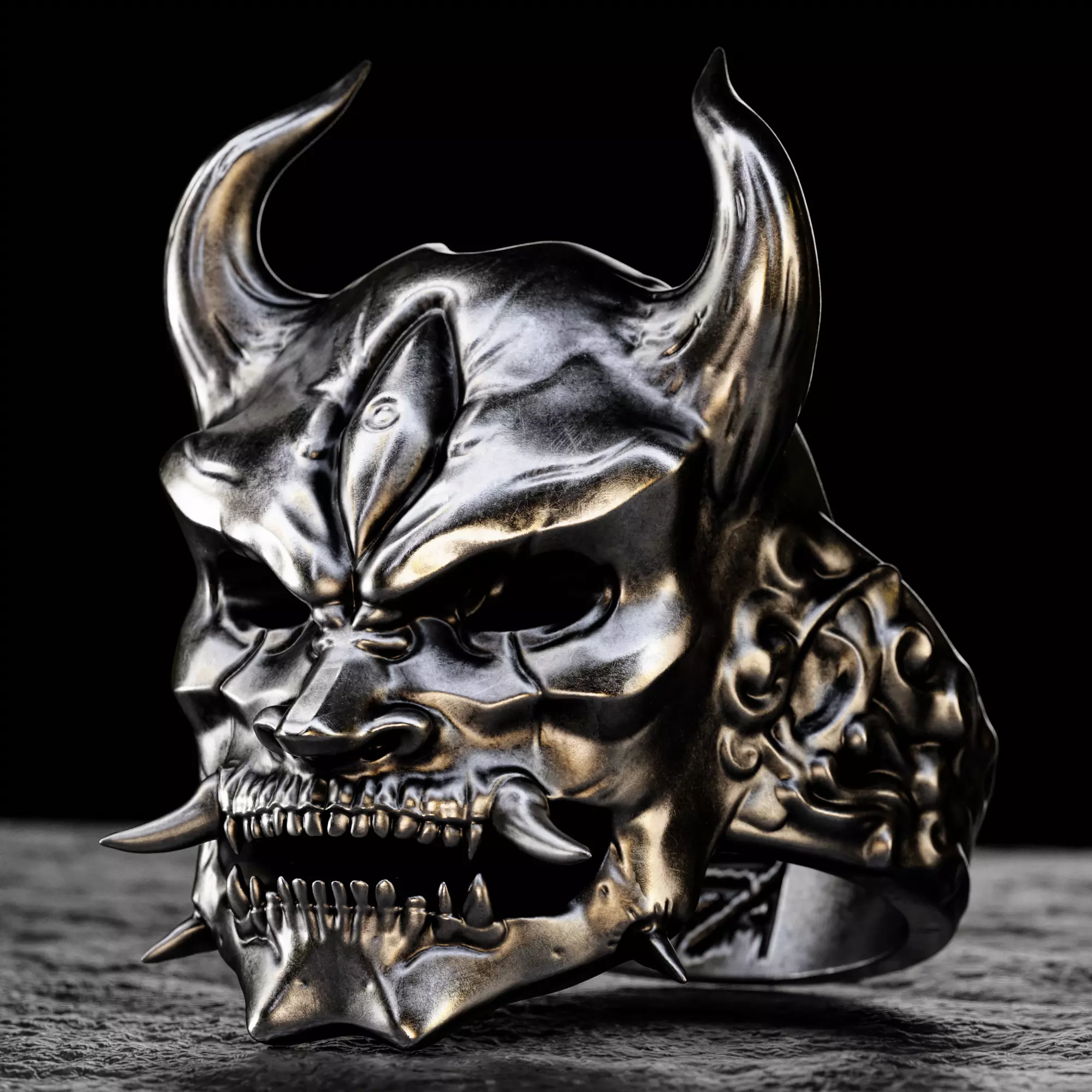 This bold and artistic ring design is inspired by the legendary Oni masks of Japanese samurai culture – fierce, protective, and full of character. The mask’s intense expression and sharp features are carefully sculpted in ZBrush to capture the dramatic spirit of a warrior in battle.