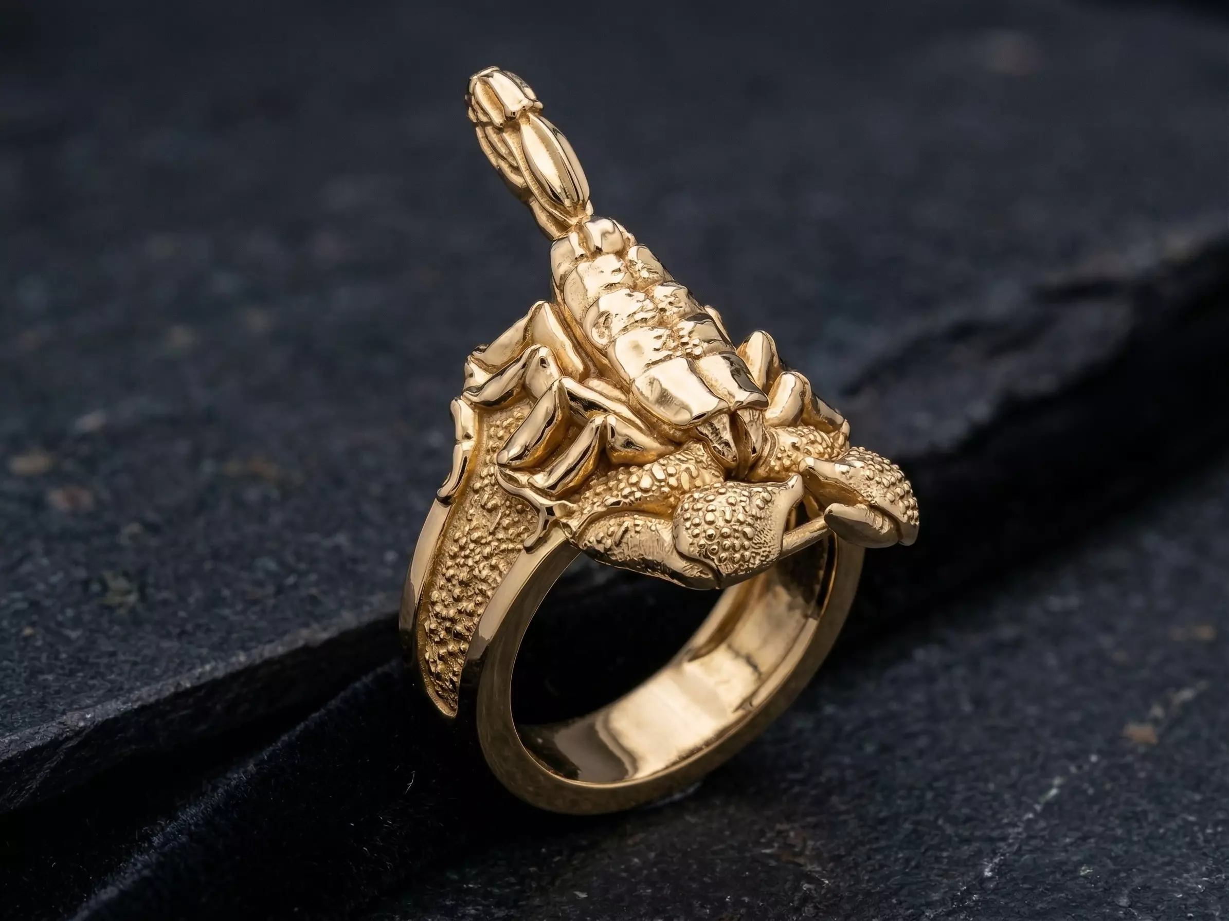 Capture the lethal elegance of the desert with this hyper-realistic Scorpion Statement Ring. This 3D model features a masterfully sculpted emperor scorpion that appears to be crawling across the wearer's finger, with its stinger poised in a dynamic, defensive strike. The design boasts incredible anatomical detail, from the segmented exoskeleton and textured pincers to the rugged, stippled background on the ring’s shoulders.
