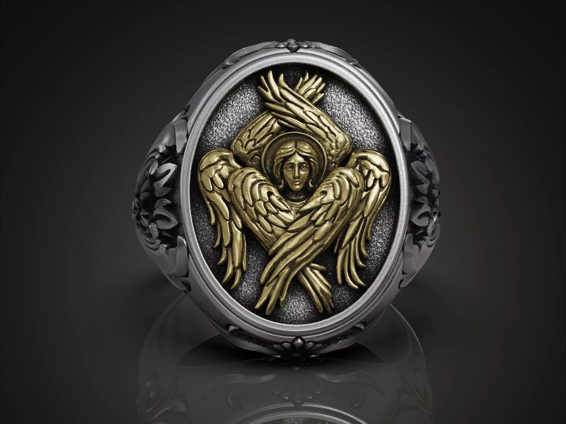 High-detail signet ring 3D model with an oval top featuring a six-winged seraphim in bas-relief. The shank and shoulders are decorated with baroque / acanthus ornaments for clean casting in precious metals.