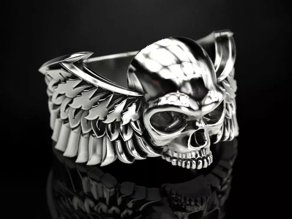 This is a skull ring with a wings motif, an ideal ring for a biker. The winged skull is a motif that has its origins in the 14th century, when the black death ravaged across Europe. The Cult of Death arose around this time and this motif became one of the its images, and this design lingered on.