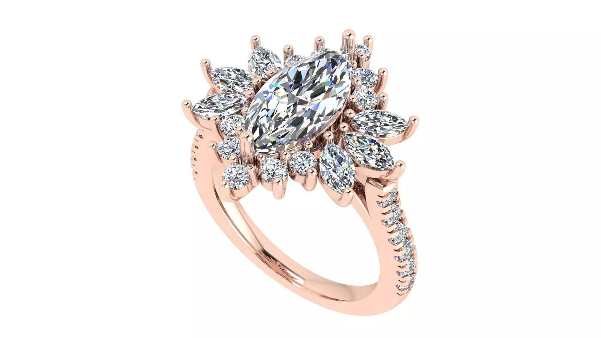 This is a ring featuring a prominent central marquise-cut diamond (12.30 x 6.00 mm, 1.60 tcw), surrounded by a halo of smaller diamonds. The halo includes 10 round diamonds (2.00 x 2.00 mm, 0.30 tcw), 6 marquise diamonds (4.50 x 2.50 mm, 0.55 tcw), and 12 round diamonds (1.70 x 1.70 mm, 0.22 tcw), for a total gem count of 29 and a total gem weight of 2.67 tcw.