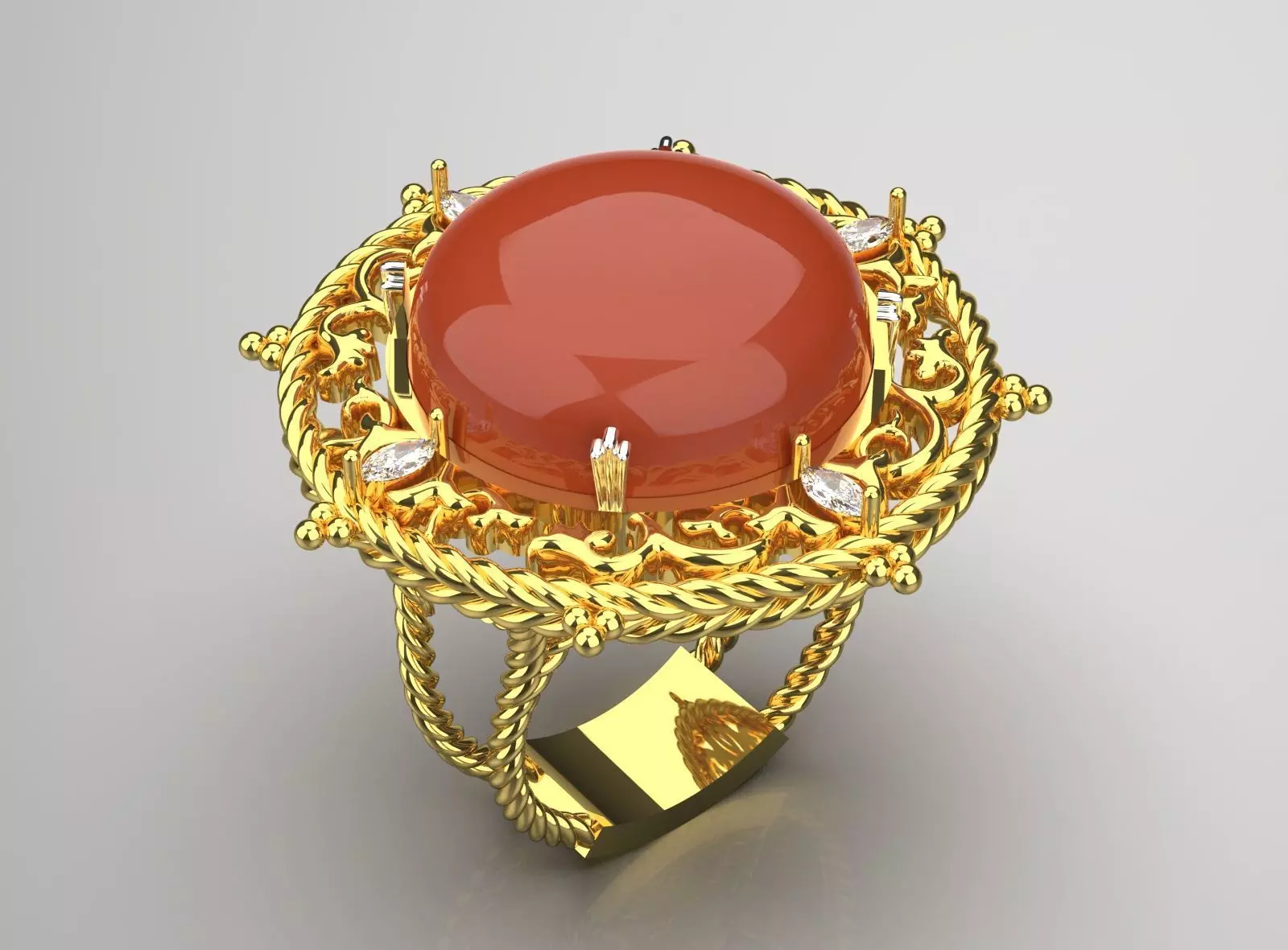 Title: Baroque Splendor, Carnelian Sparkle: Solid Gold Ring with Agate and Side Diamonds