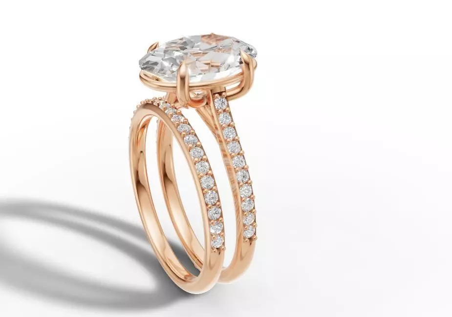 The main ring is designed for a 3.00 ct oval center stone, supported by 42 round side diamonds (1.30 mm each), totaling 0.35 ct. The half-eternity layout enhances brilliance on the top view while ensuring long-term wearing comfort.