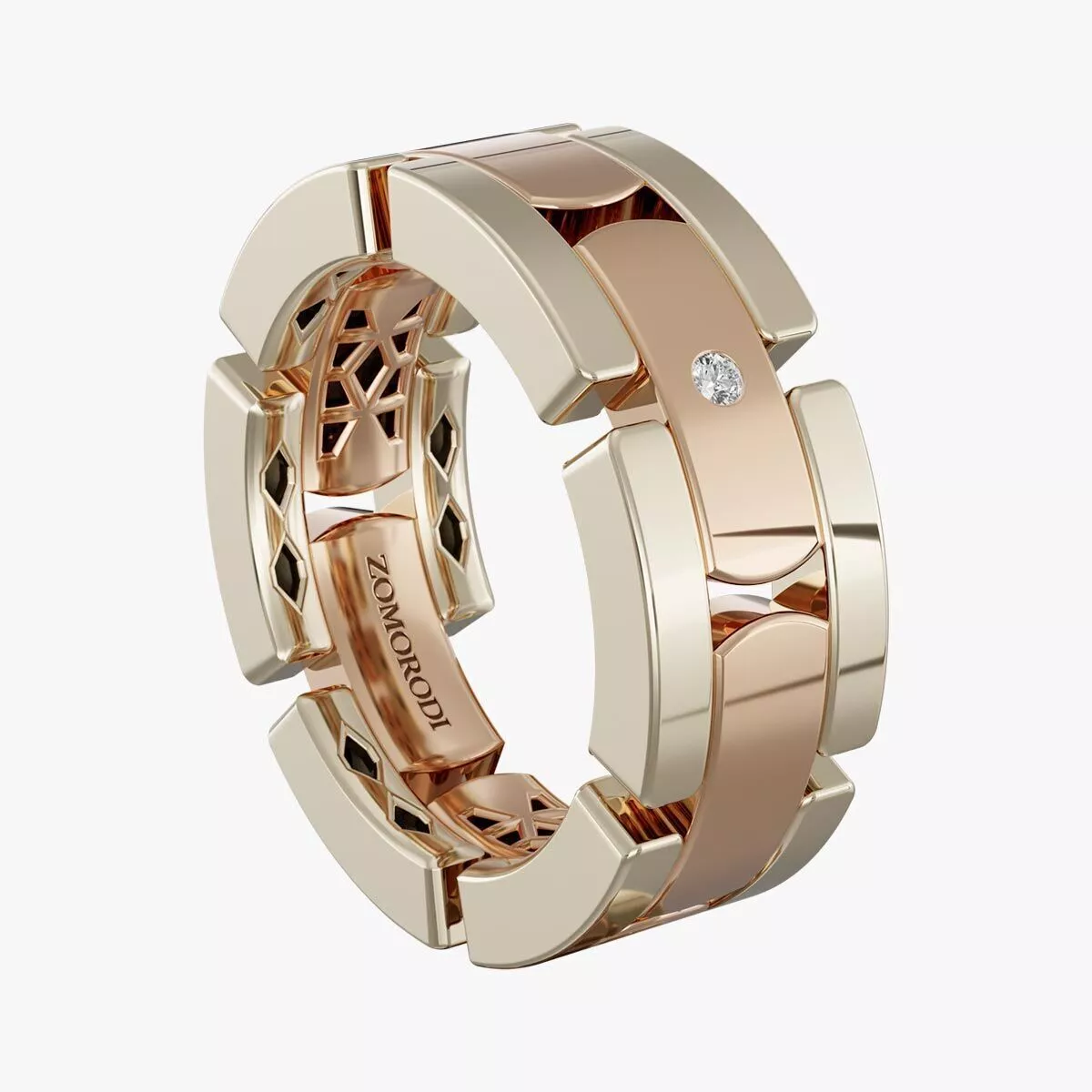 SOOREN – Zomorodi Signature CollectionEntrust your wedding ring to herald the joyous union of your marriage.The SOOREN wedding band is inspired by strength, resilience, and enduring commitment—qualities embodied in both its name and its form. Designed with a bold interlocking structure, this ring reflects the unbreakable bond it represents.Born of the earth’s unyielding strength, diamonds stand as the epitome of durability among natural materials. At the heart of this design lies a subtle yet refined round-cut diamond (approx. 1.5 × 1.5 × 0.90 mm), delicately set to enhance the ring’s character without overwhelming its architectural form.Named after a strong and heroic spirit, SOOREN is more than a ring—it is a statement of permanence, unity, and refined masculinity. A meaningful and powerful choice for a lifelong commitment.