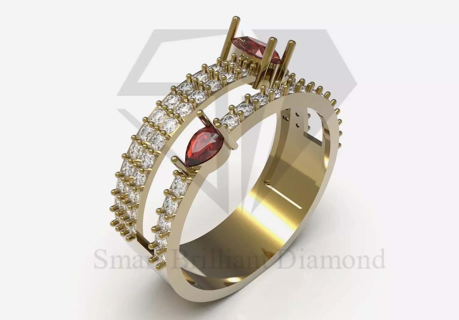 This ring is a bold and glamorous piece of jewelry, combining clean modern lines with luxurious gem work. The design is based on a Split Shank, each branch of which is completely covered with pavé stones. On this shank, three Pear Cut stones of different sizes (or in the same direction) are mounted. In the rendering, these stones appear in a dark red color (ruby or garnet).