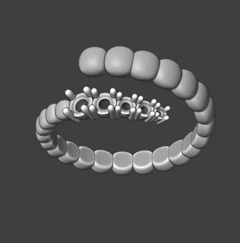 Design: This is an open ring with a spiral shape (helix of ellipsoids), consisting of spherical or ellipsoidal sections.