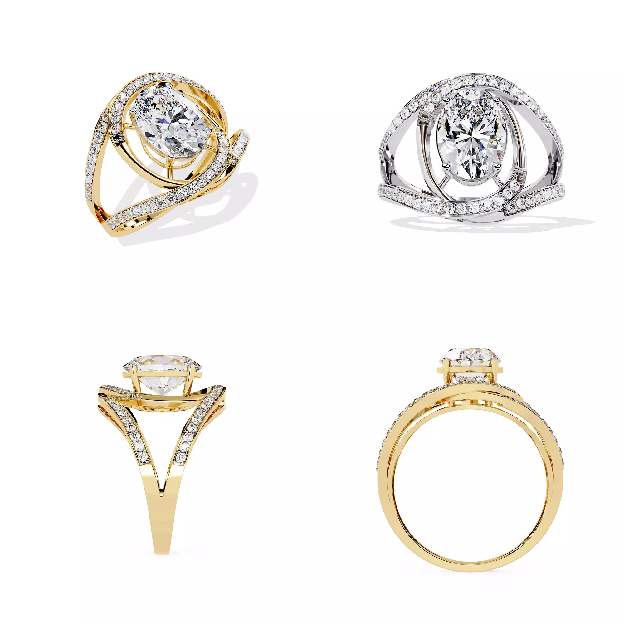 This premium CAD model features an oval brilliant center diamond set inside an interlocking spiral pavé halo, creating a modern-yet-elegant floating effect. The split-V shank design enhances visual height and showcases the solitaire beautifully from every angle, making it a perfect statement ring for luxury bridal collections.