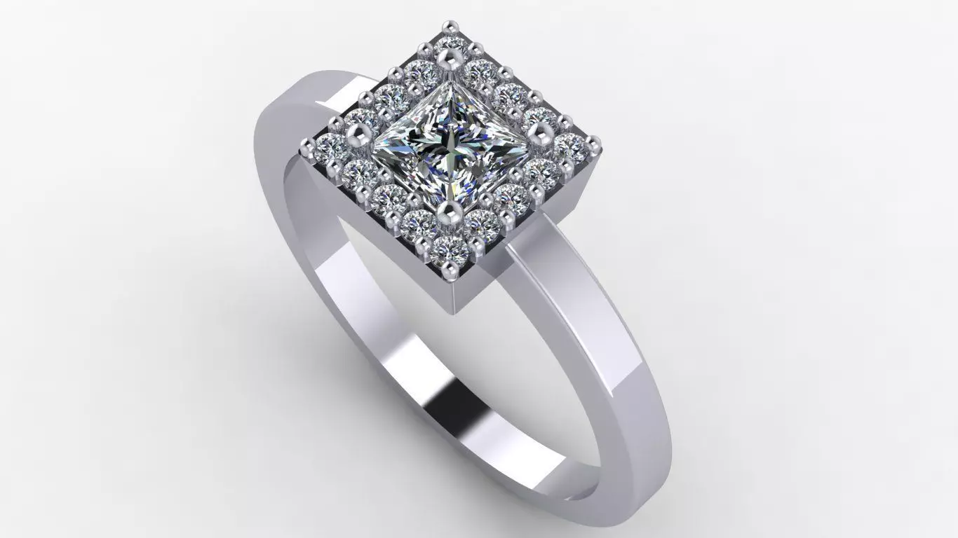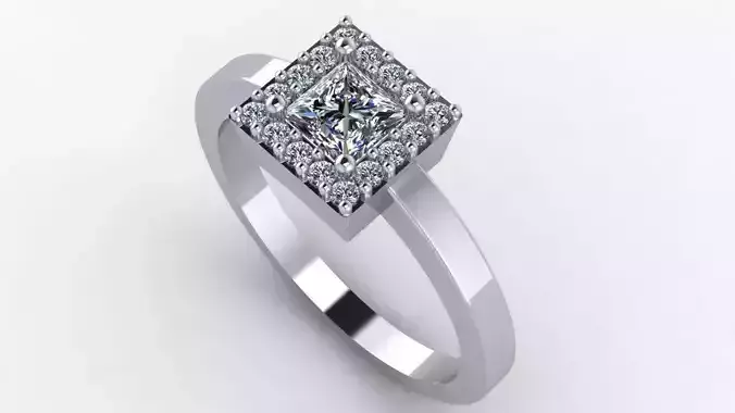 Ring featuring a princess-cut square center stone secured by four prongs, surrounded by a uniform diamond halo. The shank has a smooth, clean profile with a direct transition to the top setting, providing structural stability and ease of finishing. The model is designed with casting-ready thickness and proportions suitable for secure stone setting.
