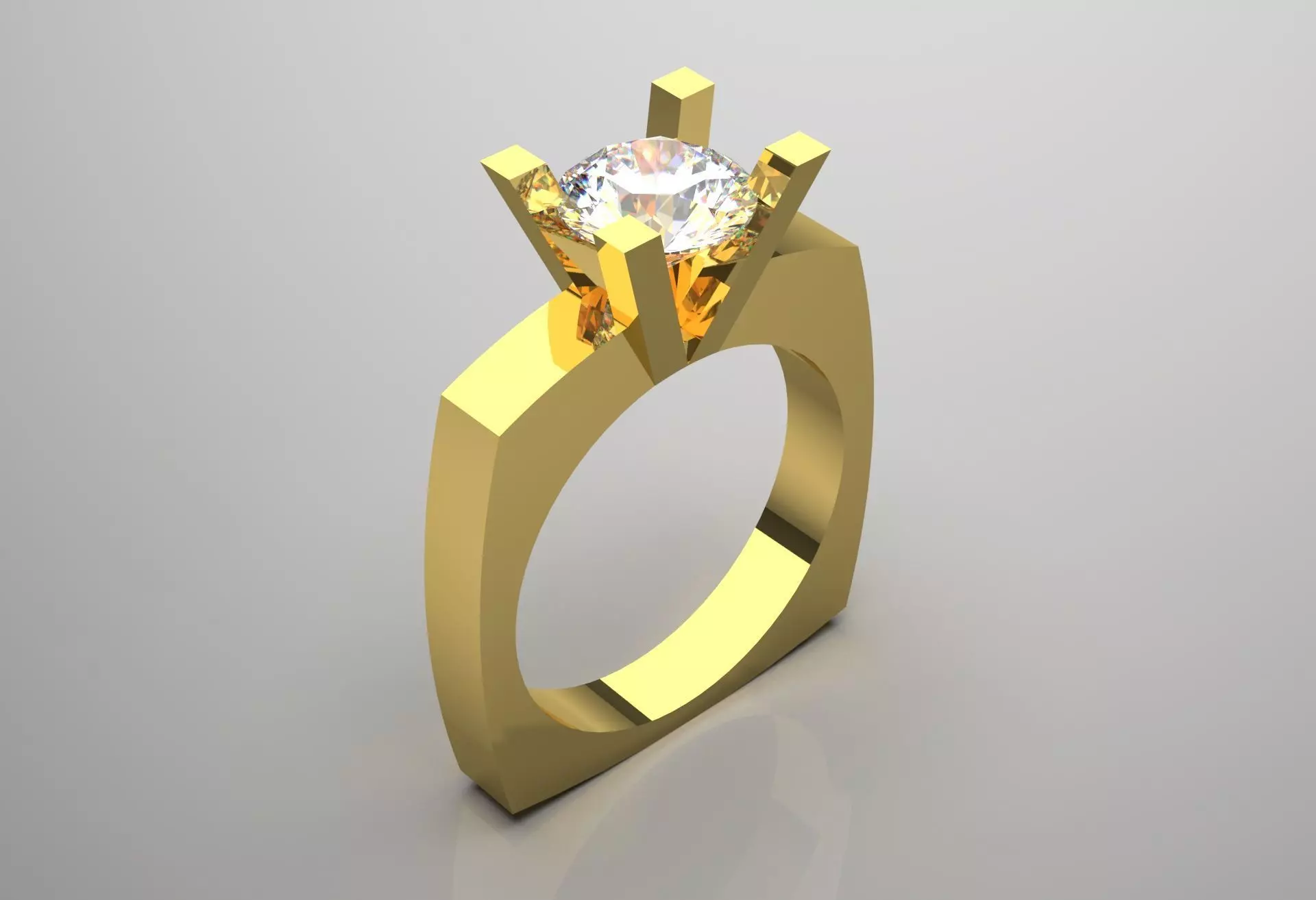This image features a striking gold ring designed with a contemporary style. The ring is crafted from polished yellow gold, giving it a luxurious and vibrant look.Its structure is modern and geometric, with a flat arm that transitions into a more sculptural top. A sparkling, prominent diamond sits at the top, held by four angled prongs. The stone is a cut diamond that reflects the light beautifully.The combination of bold lines and polished surfaces enhances its elegance, making it suitable for both engagement and fashion settings.This design combines classic elements with modern art and will appeal to those who appreciate distinctive jewelry.