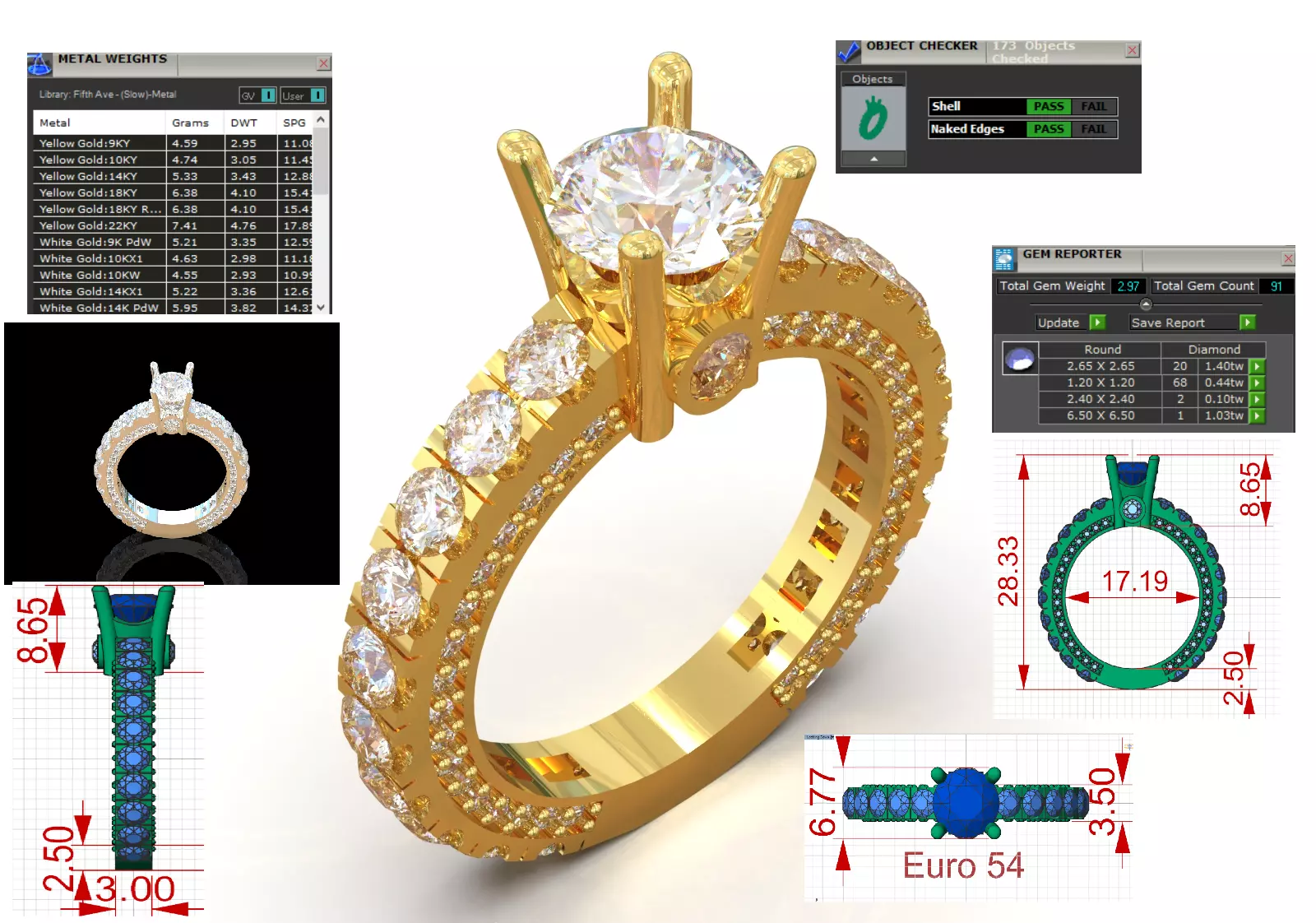 Technical Design and DetailsSolitaire Center Stone: A large, round diamond (Round Brilliant Cut) is set in a classic prong setting with six or four long prongs at the center. This type of setting allows maximum light to enter the stone.