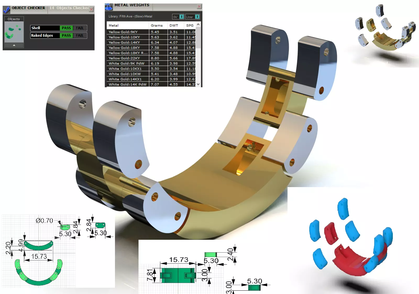 Concealed Structure Indicator: The yellow gold inner part has cuts and channels designed to precisely position the pins and conceal the hinge structure.