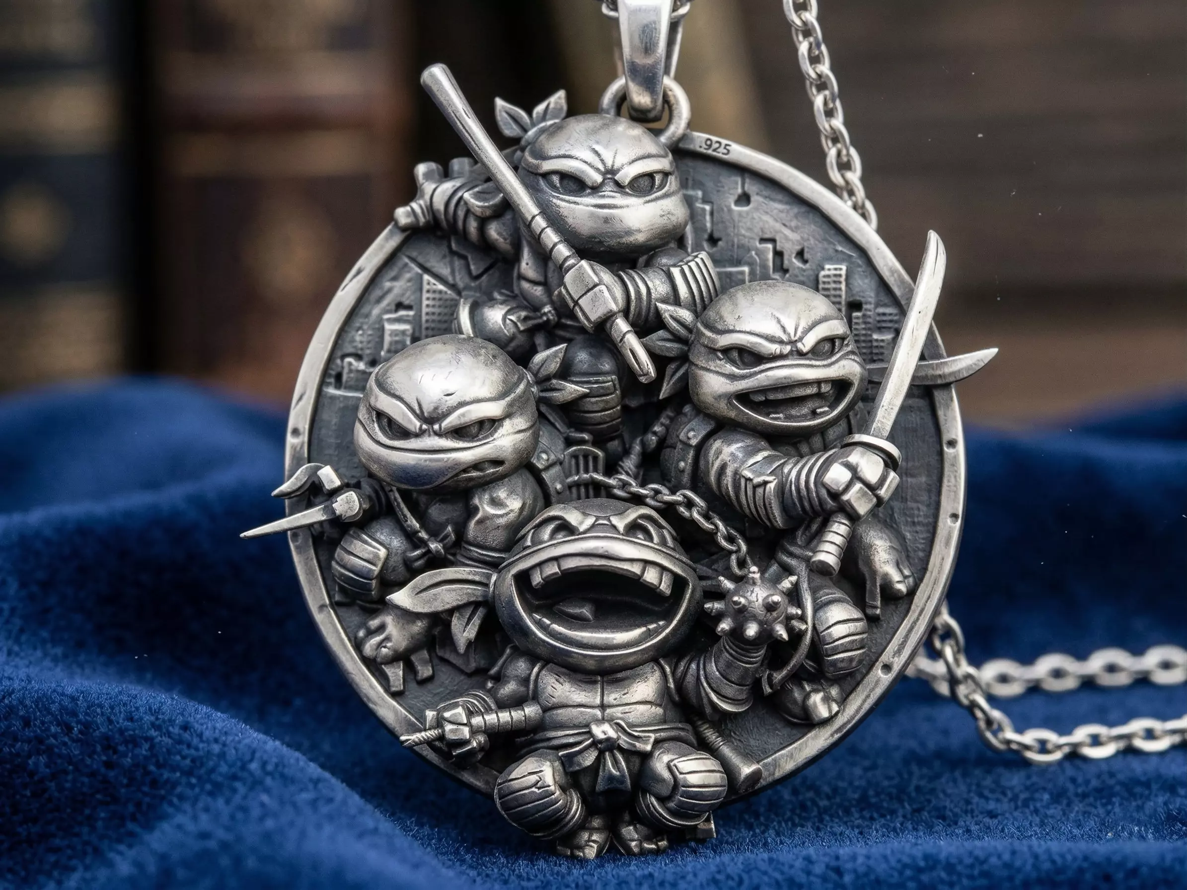 Relive the action of the sewers with this masterfully sculpted TMNT Team 3D Model. This medallion captures the unique personalities of the four ninja brothers in a vibrant, high-detail composition. Each turtle is rendered with expressive chibi proportions while maintaining the lethal detail of their iconic gear—from Leo’s katanas to Mikey’s nunchucks. The background features a textured city skyline that provides depth and a cinematic feel to the piece. Engineered for professional jewelry production, the model is optimized for high-relief casting, ensuring that every shell texture and weapon edge stands out in sterling silver, gold, or brass.