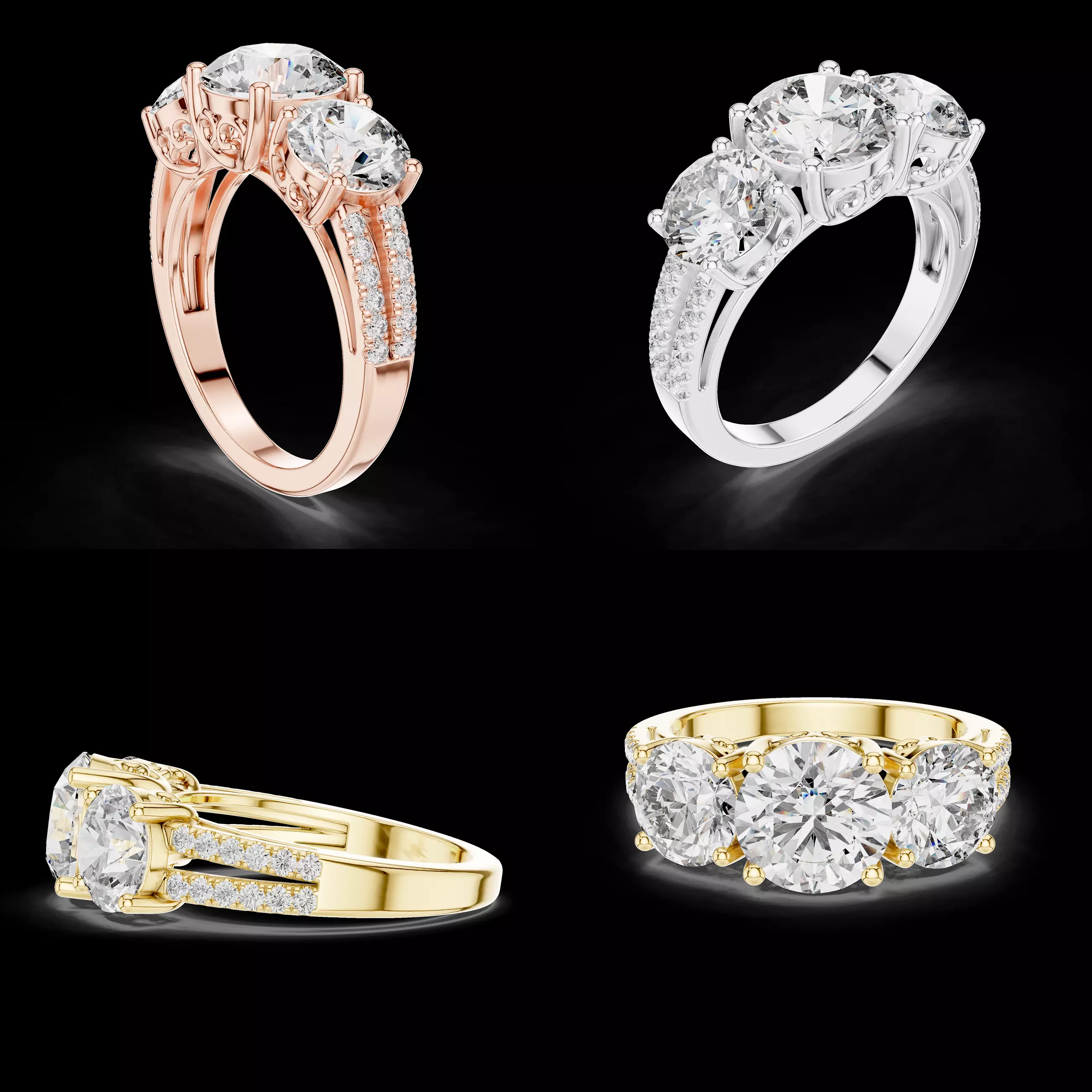 This elegant three-stone diamond ring CAD design features a timeless trilogy setting with a prominent round center diamond flanked by two perfectly matched side stones. The design symbolizes past, present, and future, making it a classic and meaningful choice for engagement and anniversary jewellery.