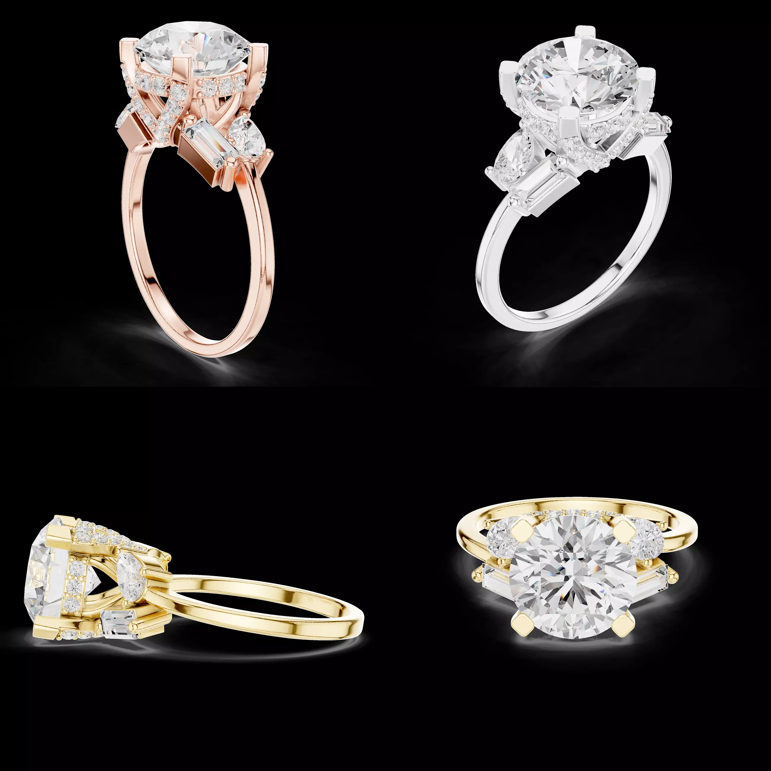 This luxurious three-stone engagement ring 3D model features a brilliant round center stone accented by elegant baguette and pear-shaped side stones, creating a refined balance of sparkle and architectural detail. A subtle hidden halo beneath the head adds extra brilliance and depth without overpowering the clean, sophisticated silhouette.