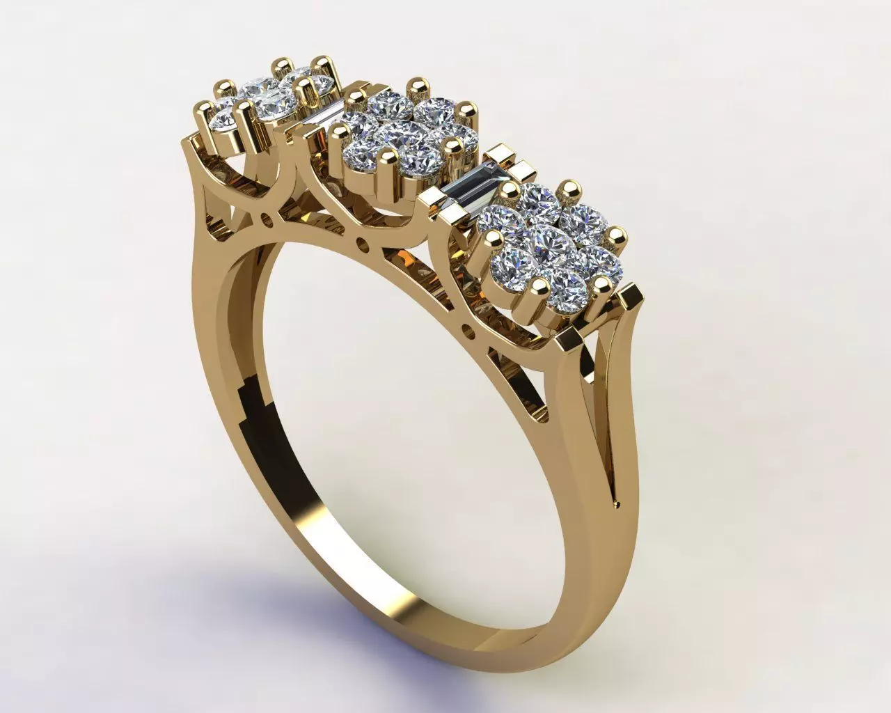Between the clusters, baguette-cut diamond accents add a refined geometric contrast, enhancing the overall sophistication of the design. The ring is built with a well-engineered open gallery structure, ensuring durability, comfort, and efficient metal usage.