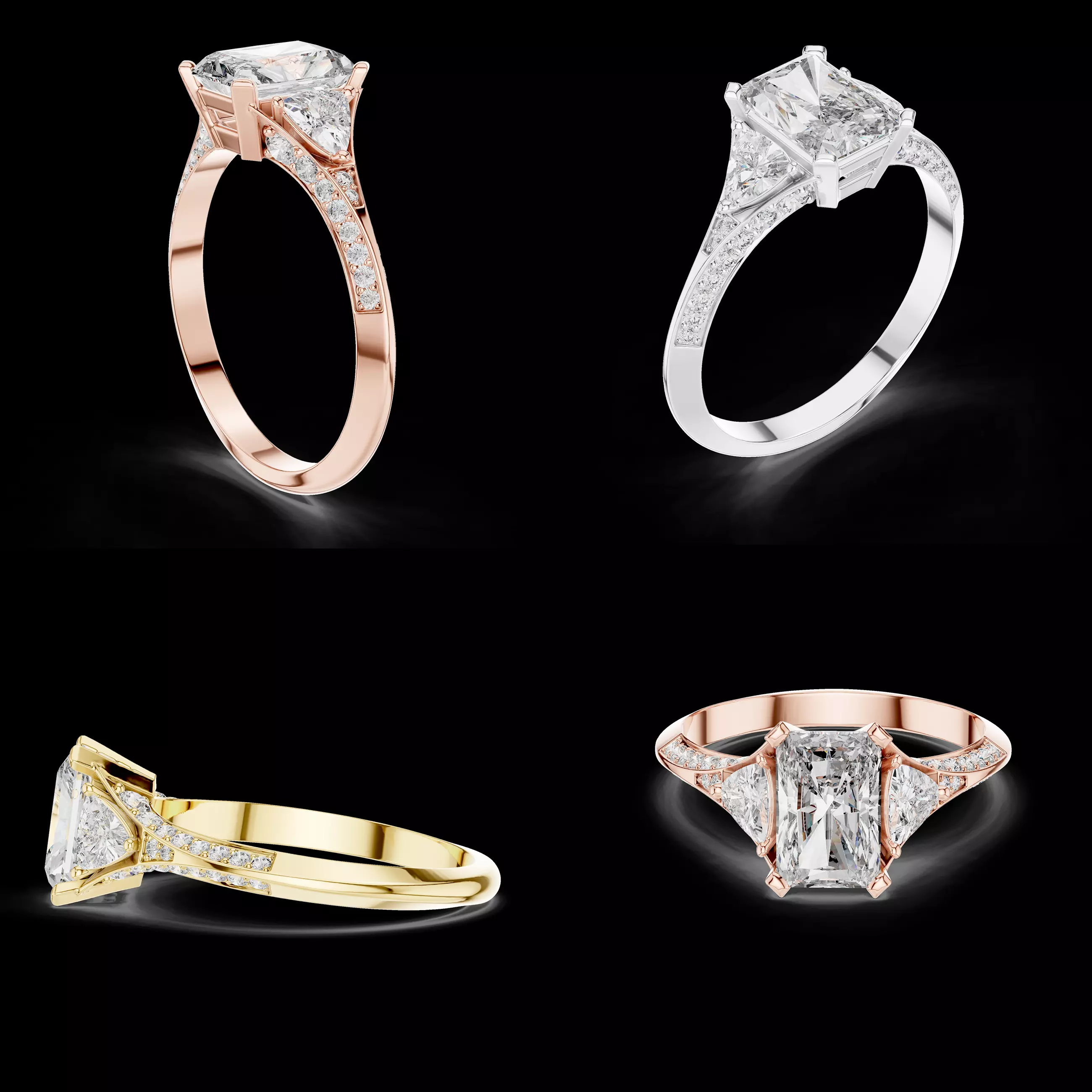 This elegant engagement ring showcases a refined emerald cut center stone flanked by two perfectly proportioned side stones, creating a classic three-stone composition with a modern tapered pavé shoulder design. The balanced layout highlights the center stone while the side stones add depth, symmetry, and visual sophistication.
