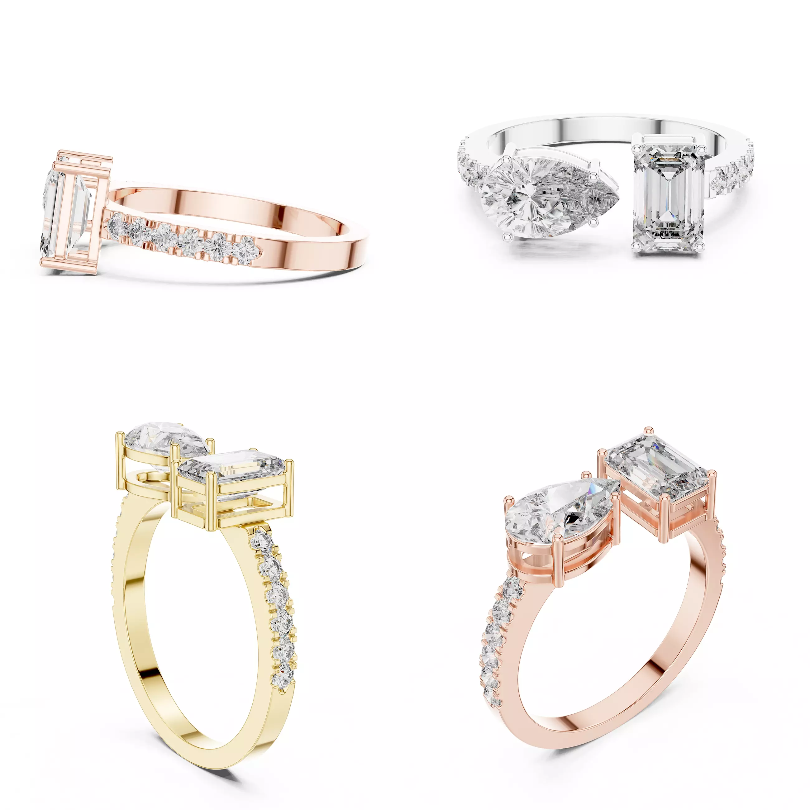 This premium ladies ring CAD model is designed in an elegant Toi et Moi (two-stone) style, featuring a refined combination of emerald-cut and pear/oval-cut diamonds. The asymmetrical layout creates a modern, luxurious look while maintaining perfect balance and wearability. Pavé-set side diamonds on the shank add extra brilliance and elevate the overall design.