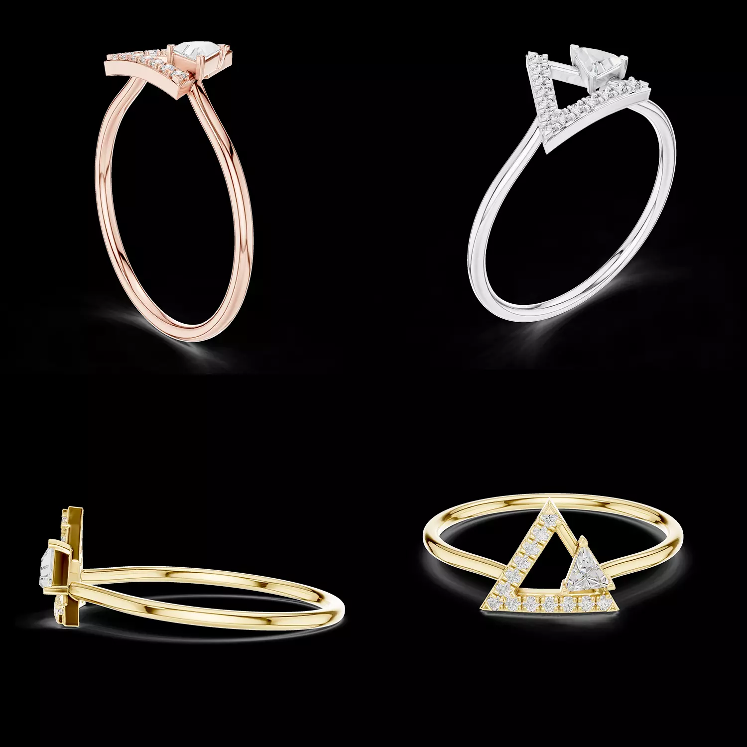 This modern geometric ring 3D model features a bold triangular design that combines architectural elegance with contemporary jewellery styling. The centerpiece is formed by a sharp triangular frame accented with small round diamonds, paired with a striking triangle-cut center stone that enhances the modern visual appeal.