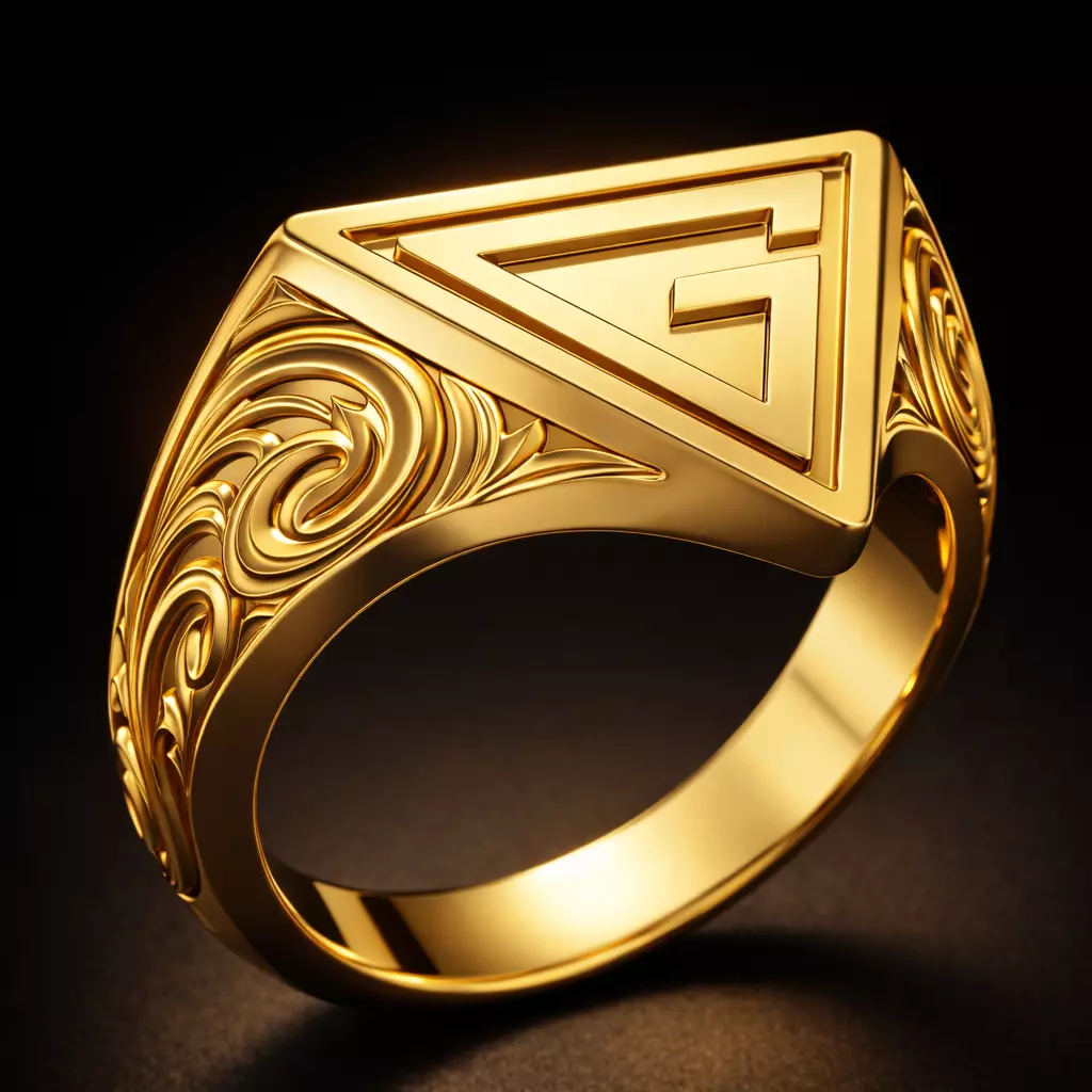 A bold triangular signet ring featuring a stylized letter G monogram engraved inside a geometric triangle frame.