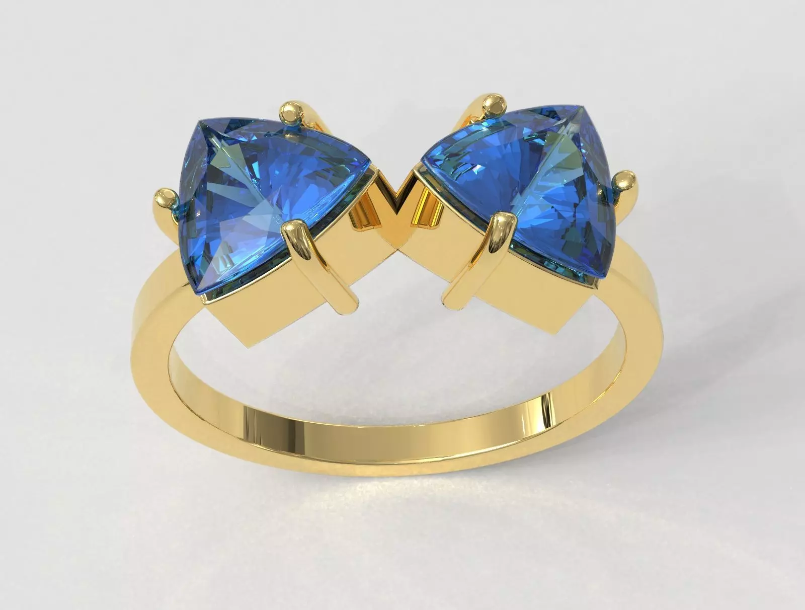 This is a beautiful and trendy ring with two trillion gemstone. You can cast it in gold or silver.