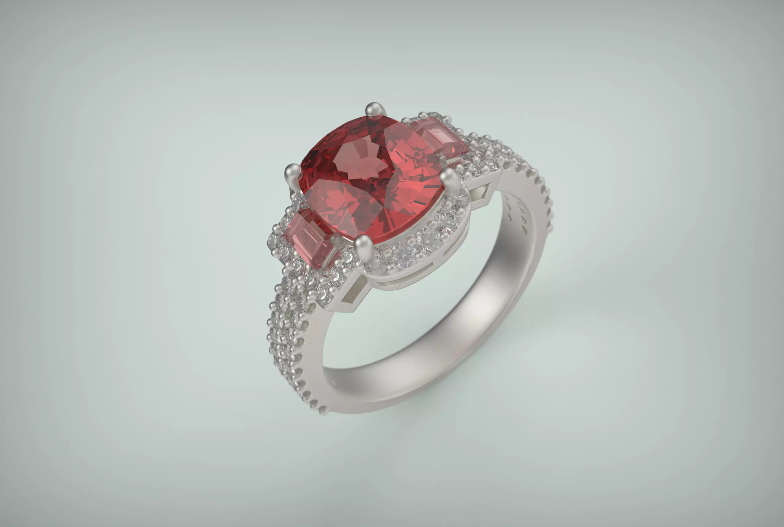Gems:1.20mm - 18pcs1.30mm - 36pcs1.50mm - 10pcsBaguette - 3.00x2.40mm - 2pcsCushion - 7.50x8.50mm - 1pcsSTL Volume - 469.5mm³Weight in Silver 925 ~ 4.92gWeight in White Gold 585 ~ 5.96gWeight in Gold Yellow 585 ~ 6.24g Ring Size - 17mm
