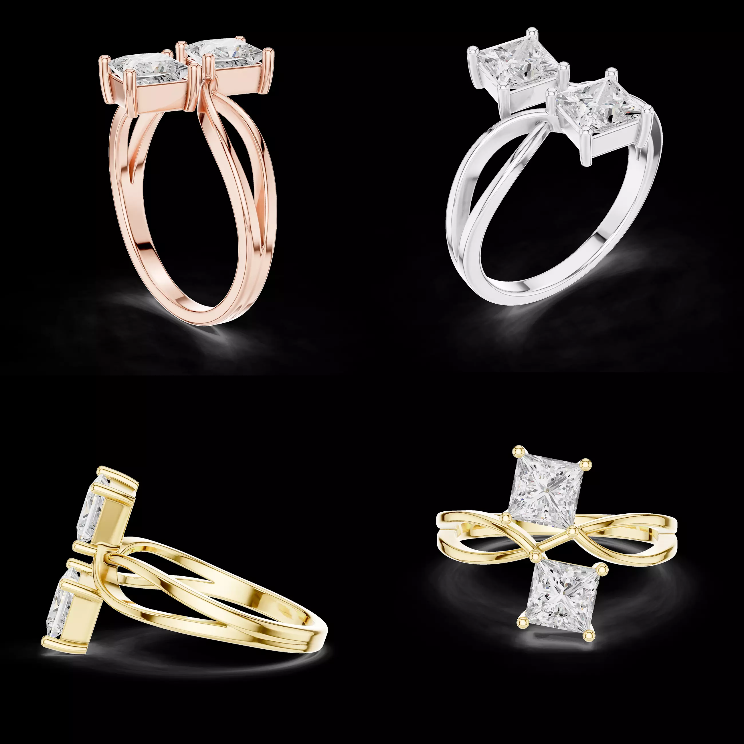 This elegant twin princess-cut diamond ring CAD model features two square gemstones arranged in a refined vertical layout, supported by a flowing split shank band that adds movement and sophistication to the design. The structure creates a modern luxury appearance while maintaining practical durability for everyday wear.