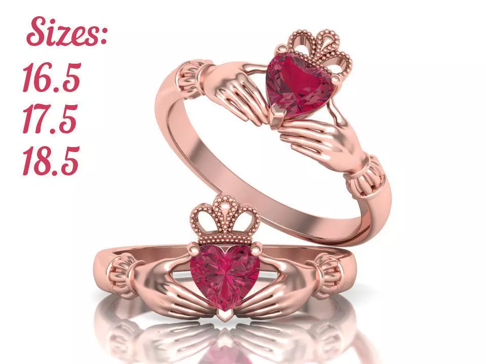 Claddagh Heart ring The Claddagh ring(3d print model of Claddagh ring)) is a traditional Irish ring which represents love, loyalty, and friendship (the hands represent friendship, the heart represents love, and the crown represents loyalty) 3 FINGER SIZES: 16.5mm 17.5mm 18.5mm Gem: 5.5mm x 5.5mm Heart cut (0.6 ct)Weight: average 3.2 gr -3.4 gr in 14K goldReady for 3d printing 3d model of Claddagh Ring ,File format : STL . STL files without any supports (because each printer needed special supports )Match-band ring: https://www.cgtrader.com/3d-print-models/jewelry/rings/unique-claddagh-band-match-ring-irish-ring-n0261All Set together cheaper:https://www.cgtrader.com/3d-print-models/jewelry/rings/wedding-set-claddagh-engagement-ring-with-heart-gem-3-sizes