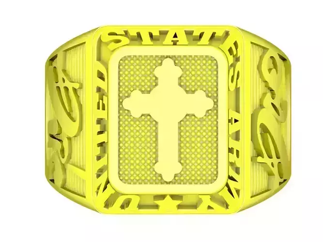 This religious cross signet ring 3D model features a bold rectangular top design highlighted by a raised Christian cross, symbolizing faith, protection, strength, and spiritual devotion. The clean geometry of the signet face is balanced with decorative side details, creating a masculine and dignified appearance suitable for men’s religious jewelry.