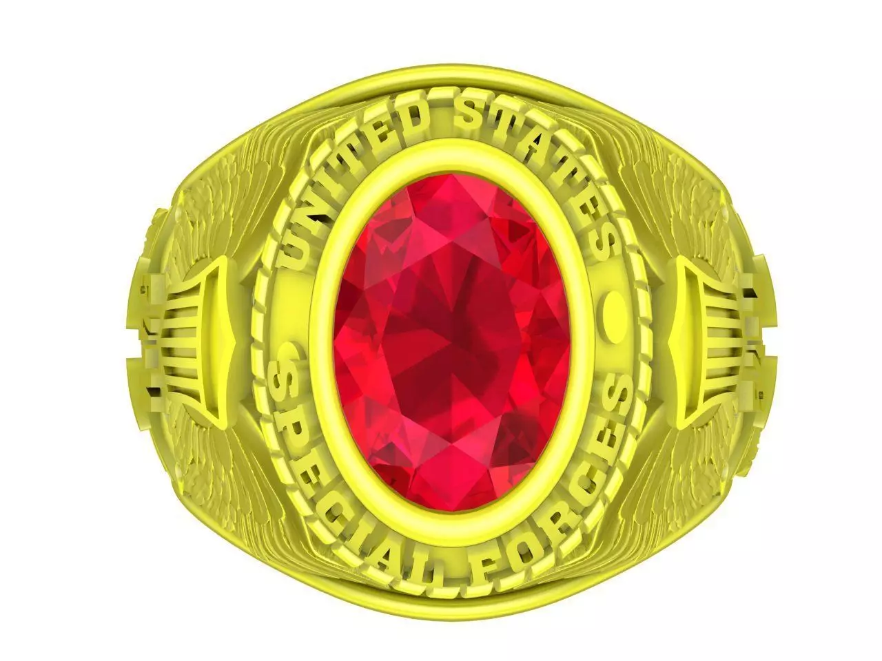 This Special Forces oval gemstone signet ring 3D model features a bold oval center stone set within a classic military-inspired signet ring design. The wide band is richly detailed with engraved text, symbols, and emblematic elements, creating a powerful and authoritative aesthetic commonly associated with heritage, honor, and strength.