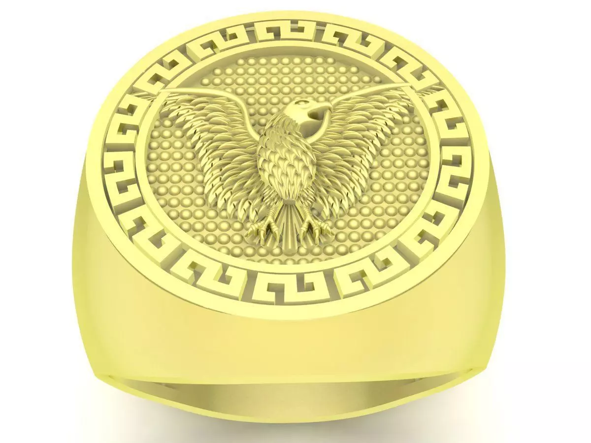 This eagle signet ring design features a bold round top engraved with a powerful eagle symbol, surrounded by a classic Greek key border. The eagle represents strength, authority, vision, and freedom, making this ring ideal for statement and symbolic jewelry collections.