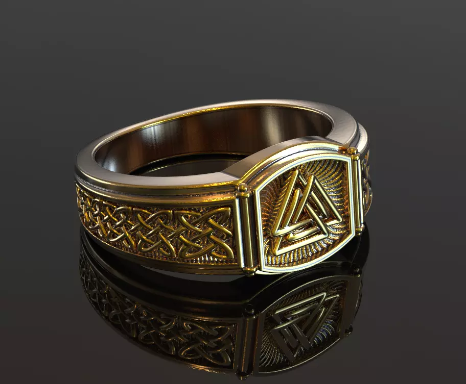 There is jewelry viking ornament ring 3d model .On top of the signet is valknut symbol.And ont the sides of the ring is viking ornamet with knots.