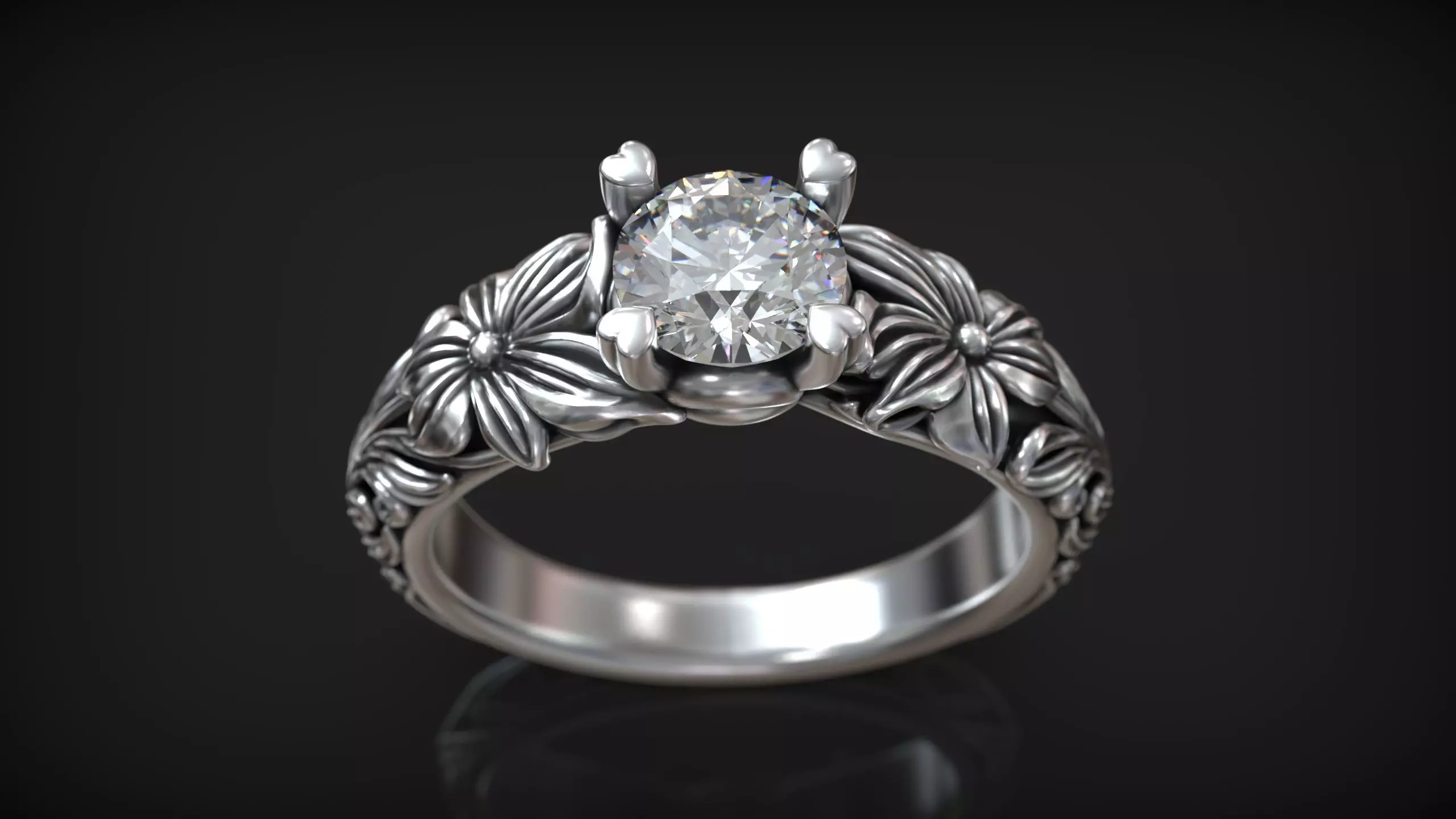 This 3D model features an intricately designed engagement ring inspired by nature and vintage floral motifs. The ring band is richly adorned with detailed reliefs of blooming flowers and flowing leaves, seamlessly wrapping around the shank in a continuous botanical pattern.