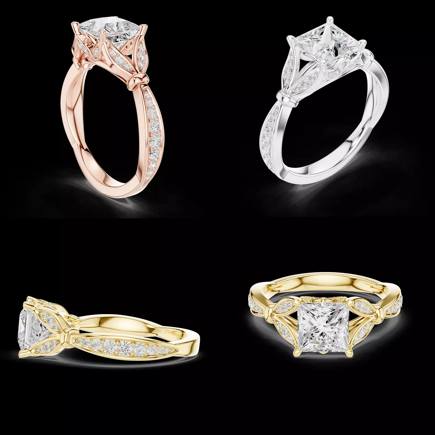 This model is ideal for bridal jewellery brands, custom designers, and manufacturers seeking a romantic yet structured princess-cut engagement ring with intricate detailing and professional casting standards.