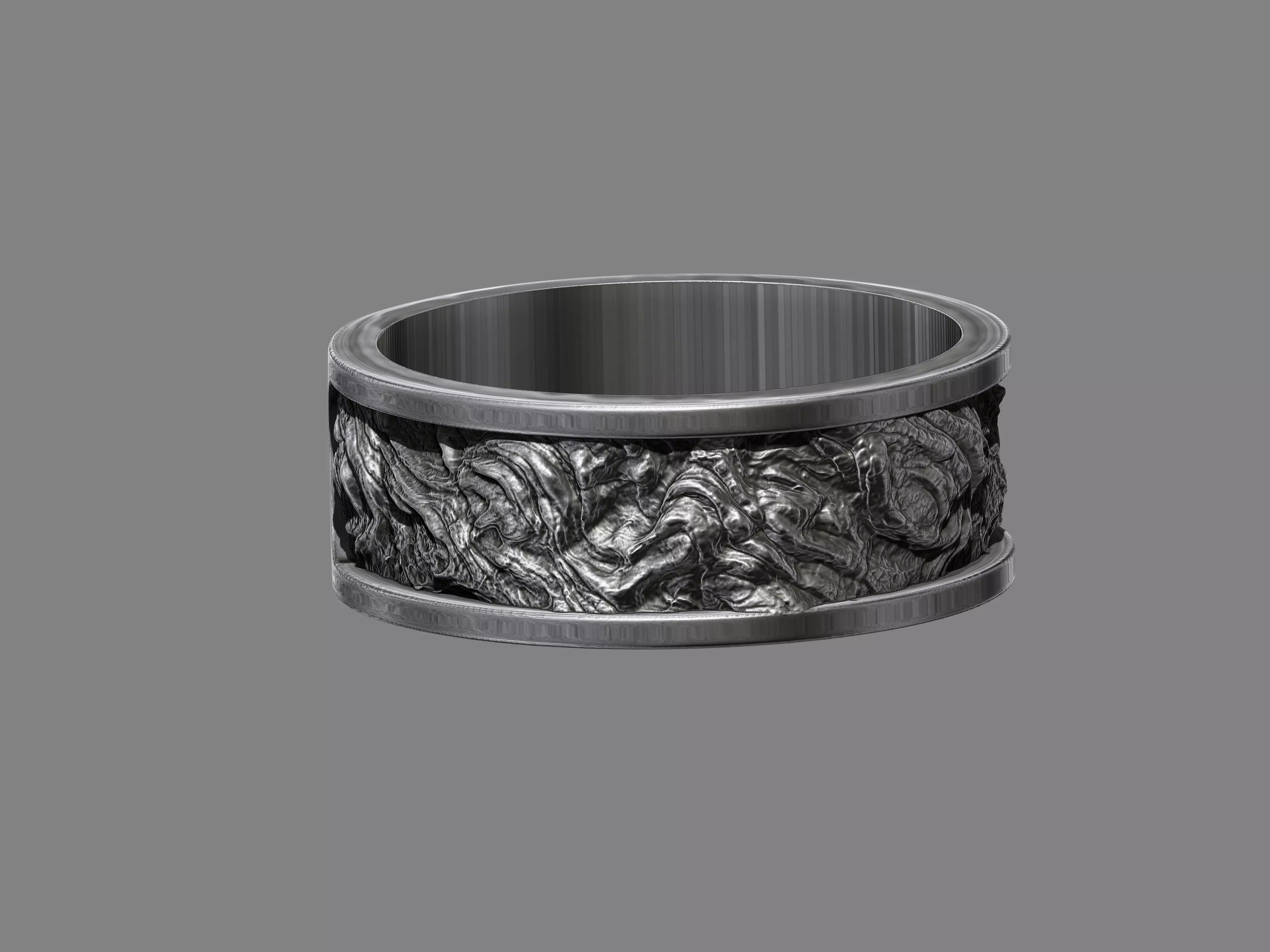 A powerful wedding band inspired by flowing molten lava and volcanic rock textures. The rugged, organic surface wraps around the ring, capturing movement and raw energy while symbolising passion, strength, and transformation. Designed for high-quality 3D printing and suitable for metal casting, this ring is ideal for wedding bands, promise rings, or bold statement jewellery with a natural elemental aesthetic.