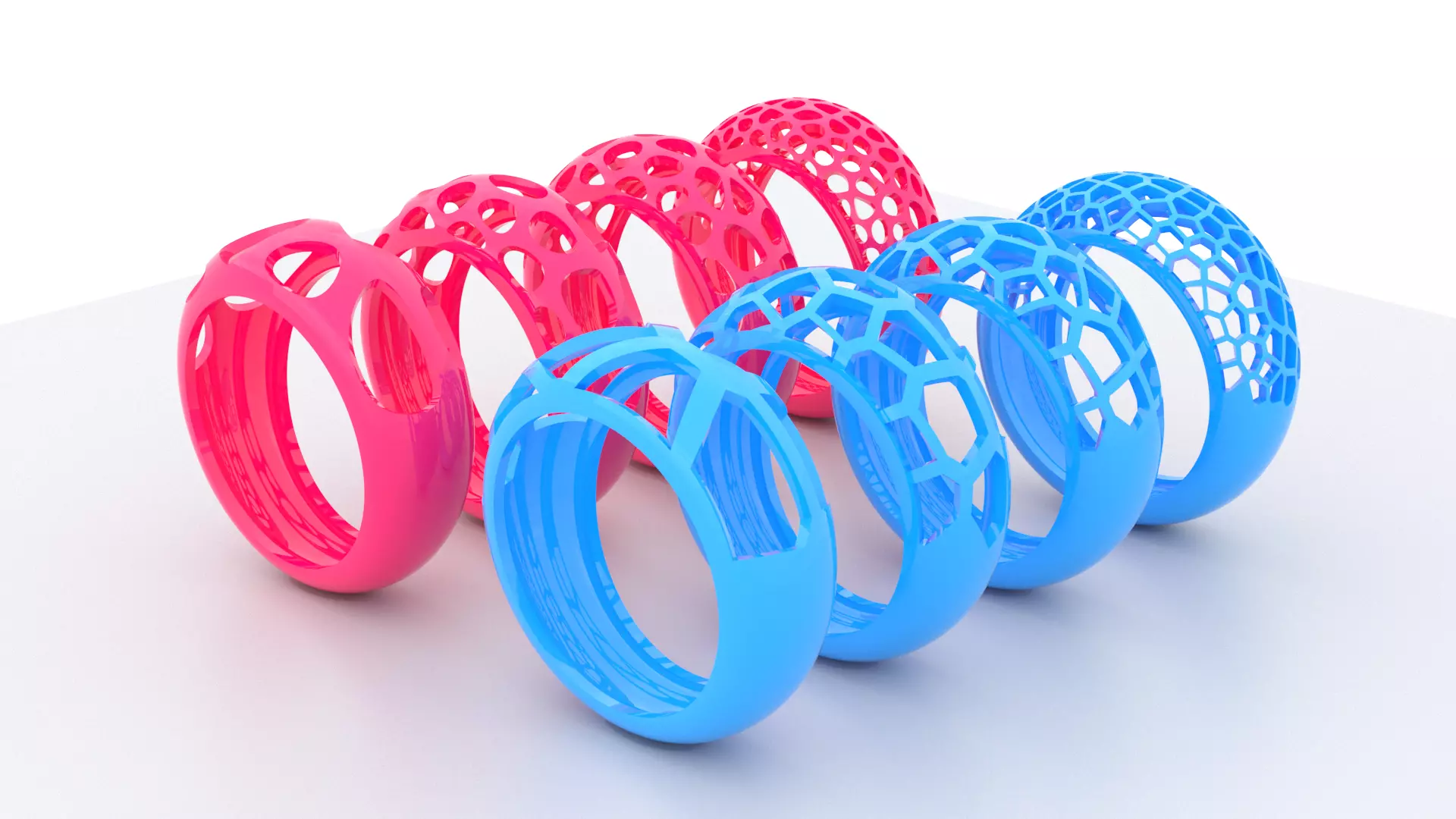 Eight Rings with Voronoi Pattern, the Jewelry Pack of Eight has polygonal cells Pattern Mesh form, each Ring has it's own density and number of Cells, the models were created using computational parametric tools to achieve the most accurate geometry with clean details, it could be used for 3d printing as a fashion accessory and wearable, it suits most of fingers sizes for easy wear and not to be uncomfortably tight on fingers, the designs are unique and suits the modern fashion era of digital fabrication, cyber style, generative design and scifi conceptual art designs.