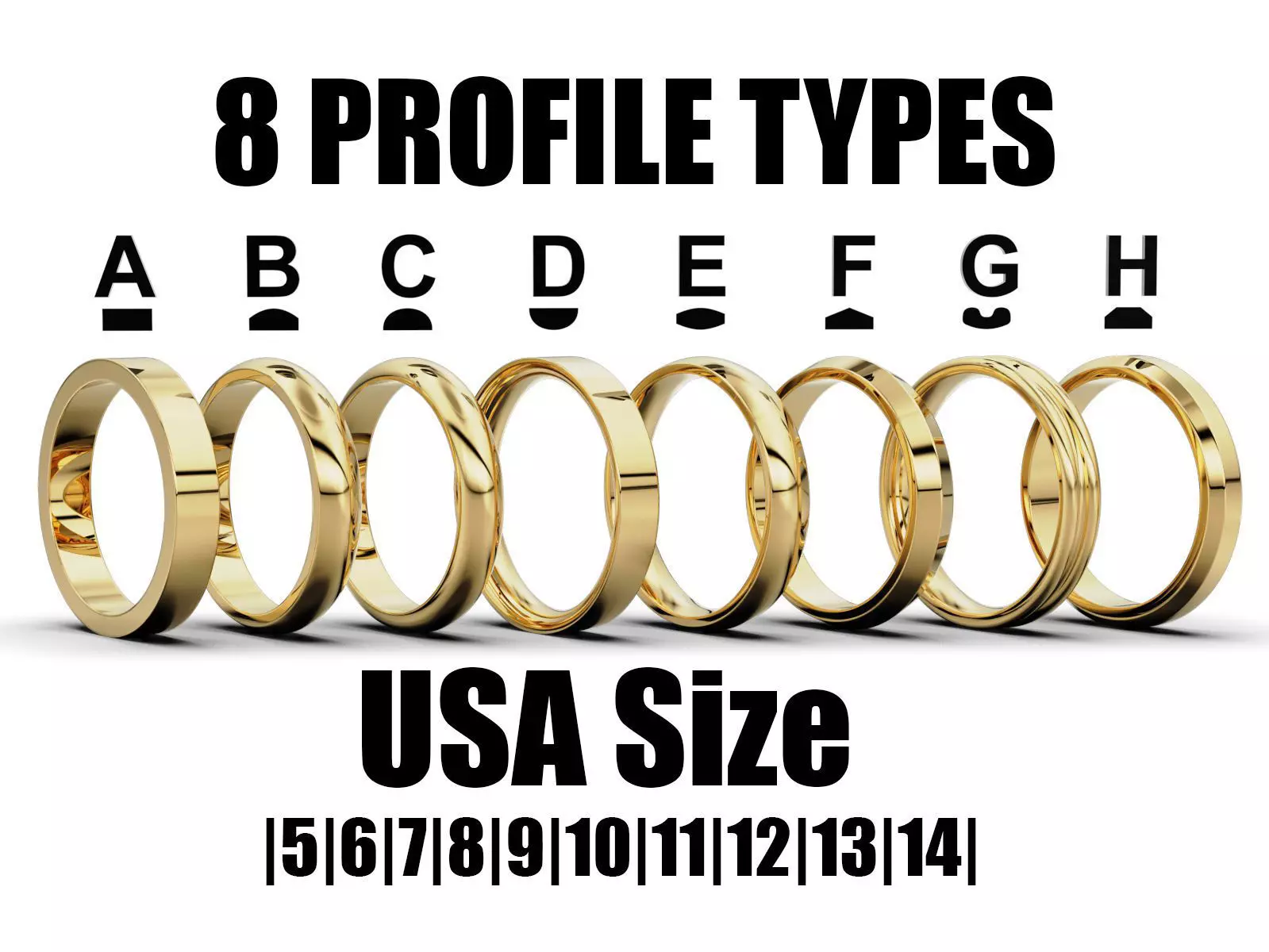 Set of 8 wedding band profiles in different shapes, designed for 3D printing and jewelry casting. Available in USA ring sizes 5 to 14, these versatile bands cater to various design preferences. Ideal for crafting gold, platinum, or silver wedding rings.